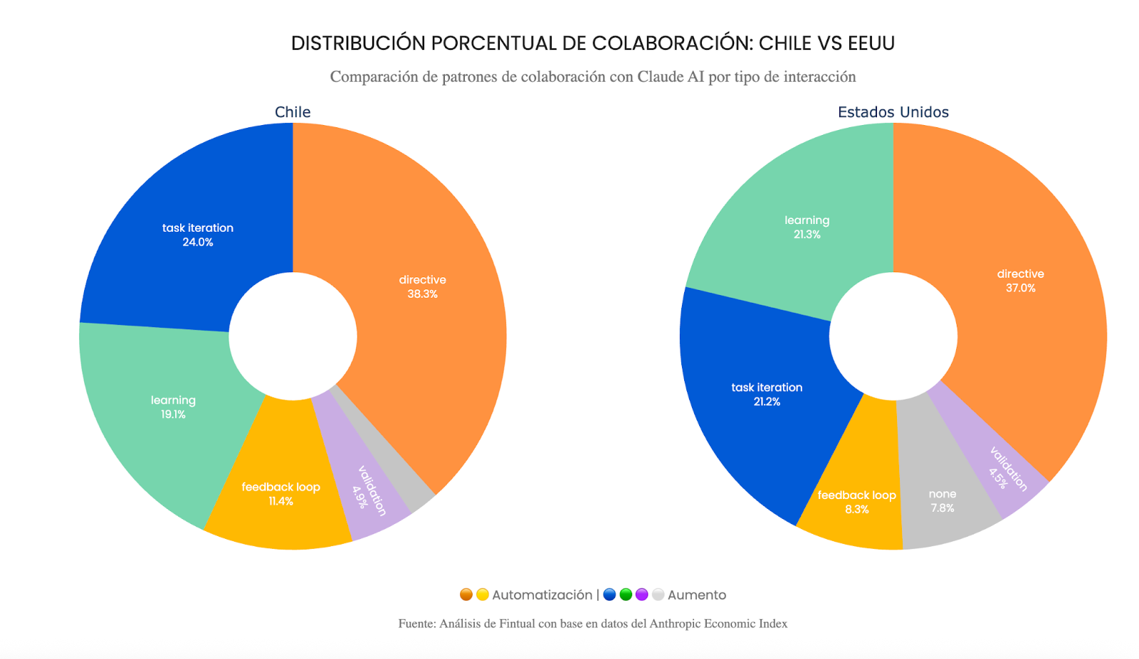 En Chile, según los datos de Anthropic, la IA se usa para tareas de automatización relativamente más que en Estados Unidos.