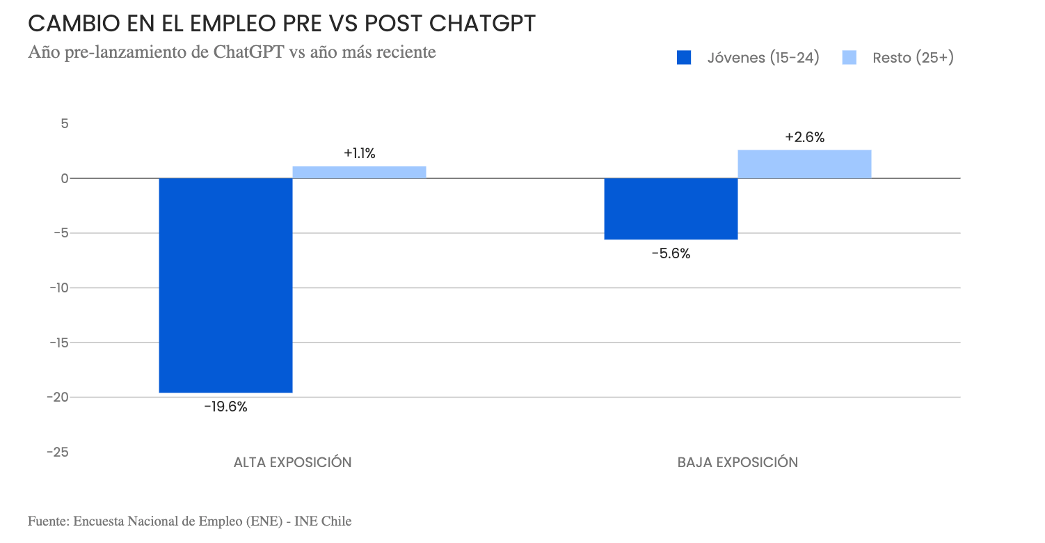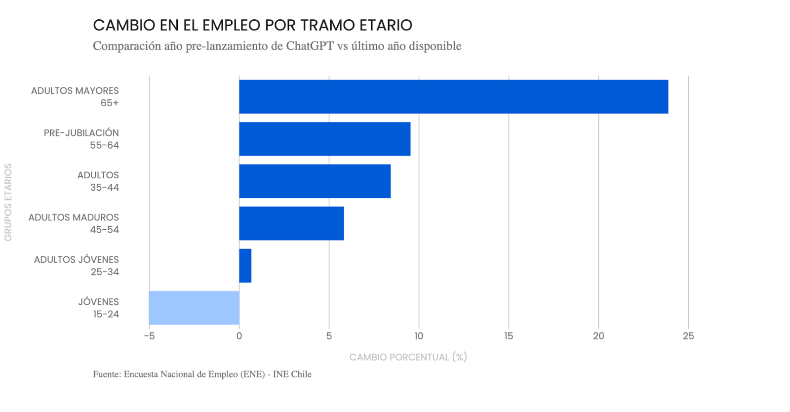 Crucialmente, el análisis reporta que estos mayores costos "pueden estar actuando como un catalizador de procesos de cambio tecnológico". Si la evidencia estadounidense sobre vulnerabilidad del empleo joven en ocupaciones automatizables es extrapolable, Chile podría enfrentar una doble transición: ajuste a costos laborales más altos que simultáneamente acelera adopción de tecnologías que, como muestra el estudio de Stanford, afectan desproporcionadamente a trabajadores que inician sus carreras laborales.