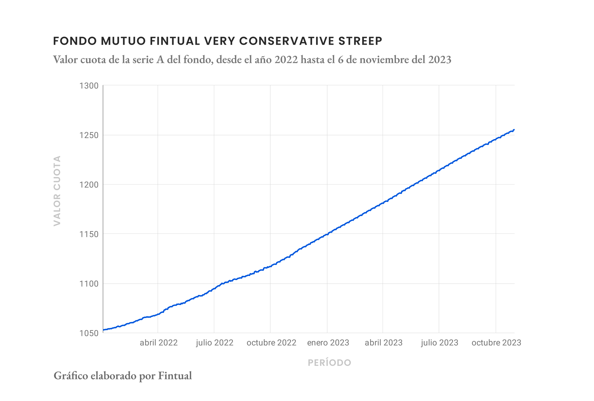 - Las rentabilidades nominales del Fondo Mutuo Fintual Very Conservative Streep corresponden a la serie A del fondo, que al cierre de 06/noviembre/2023 son: 0,78% último mes, 2,49% últimos tres meses, 11,34% último año.