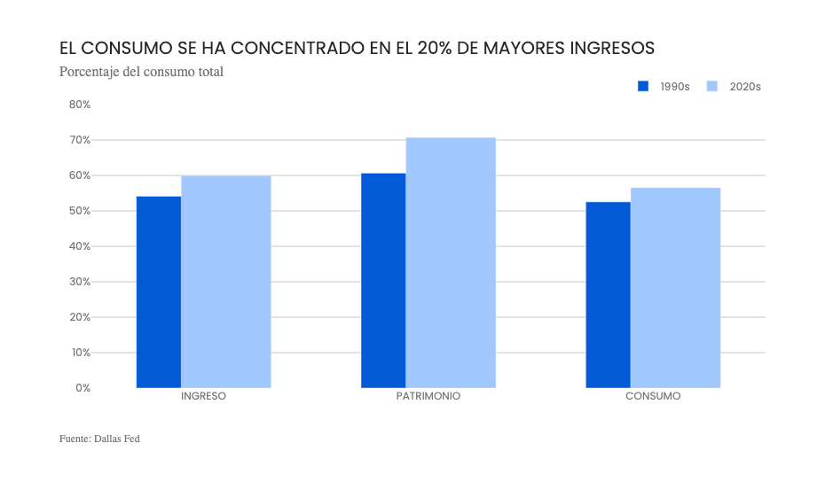 Según un estudio reciente de la Reserva Federal de Dallas, hoy el 20% de los hogares con mayores ingresos es responsable del 57% del consumo total en Estados Unidos. El incremento en la concentración del consumo refleja una tendencia más amplia: la participación de este grupo en los ingresos totales pasó del 54% al 60%, mientras que su participación en la riqueza creció del 61% al 71% en el mismo período.