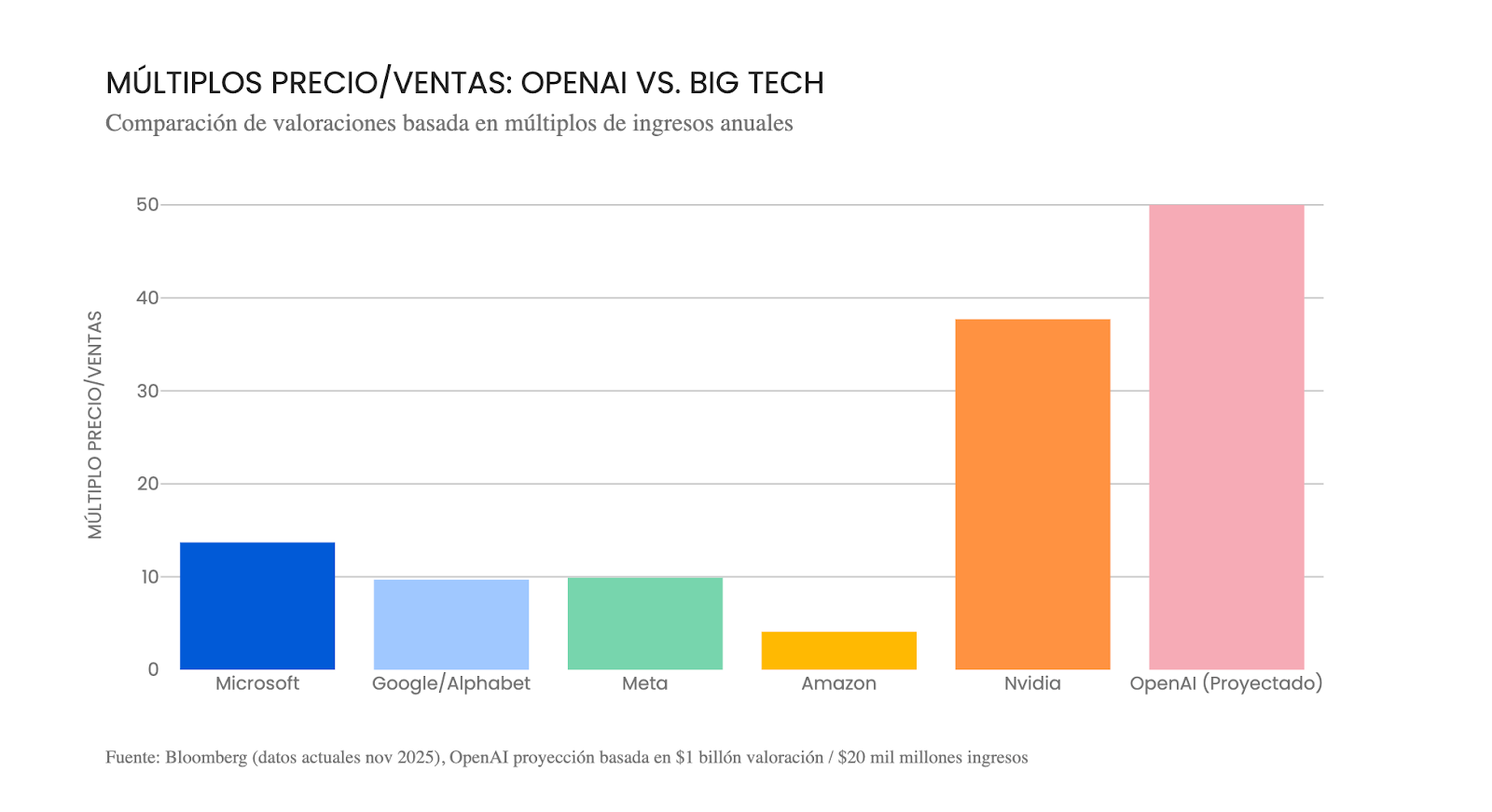 Dicho lo anterior, los múltiplos de valorización obligan a un llamado a la cautela. Aun aceptando que se trata de compañías en una etapa temprana de monetización, los múltiplos de valoración de empresas como OpenAI —por ejemplo la razón precio/ventas— se sitúan en niveles elevados y dejan poco margen para errores de ejecución.