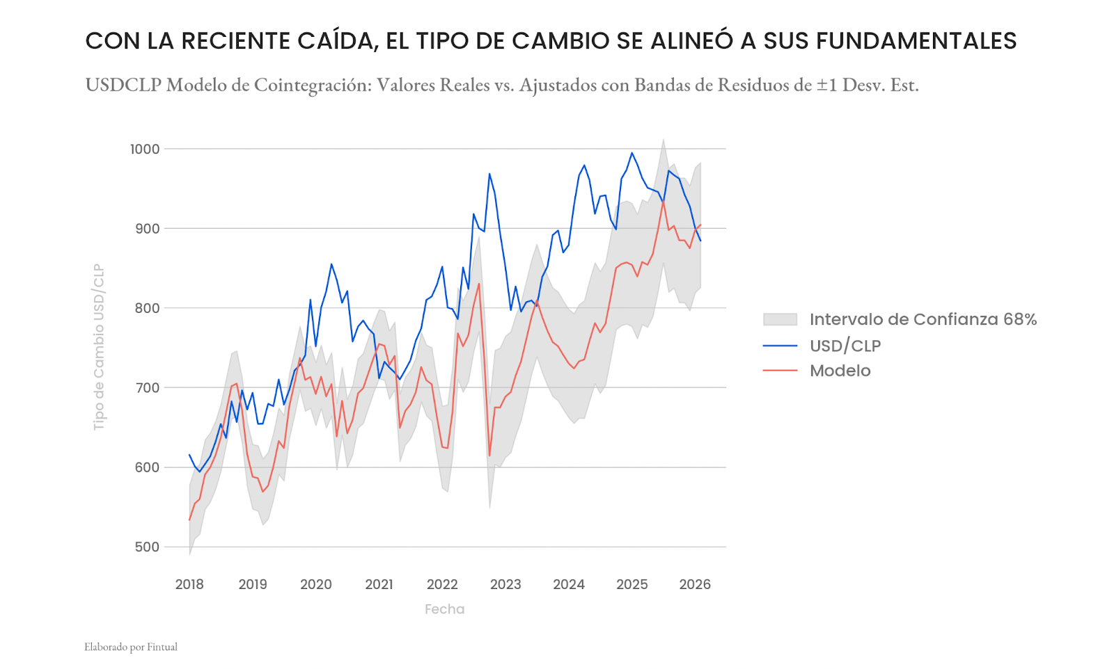 En primer lugar, en materia cambiaria, nuestra visión es que el peso chileno se encuentra actualmente cercano a su nivel de equilibrio de largo plazo. Tras la apreciación observada en los últimos meses —que llevó al dólar a ubicarse por debajo de los $900—, el nivel vigente ya incorporaría factores clave como los elevados precios del cobre, el diferencial de tasas de interés a nivel internacional y el nuevo escenario político del país. En el siguiente gráfico, cuantificamos esta relación mediante un modelo fundamental de largo plazo para el tipo de cambio peso–dólar.