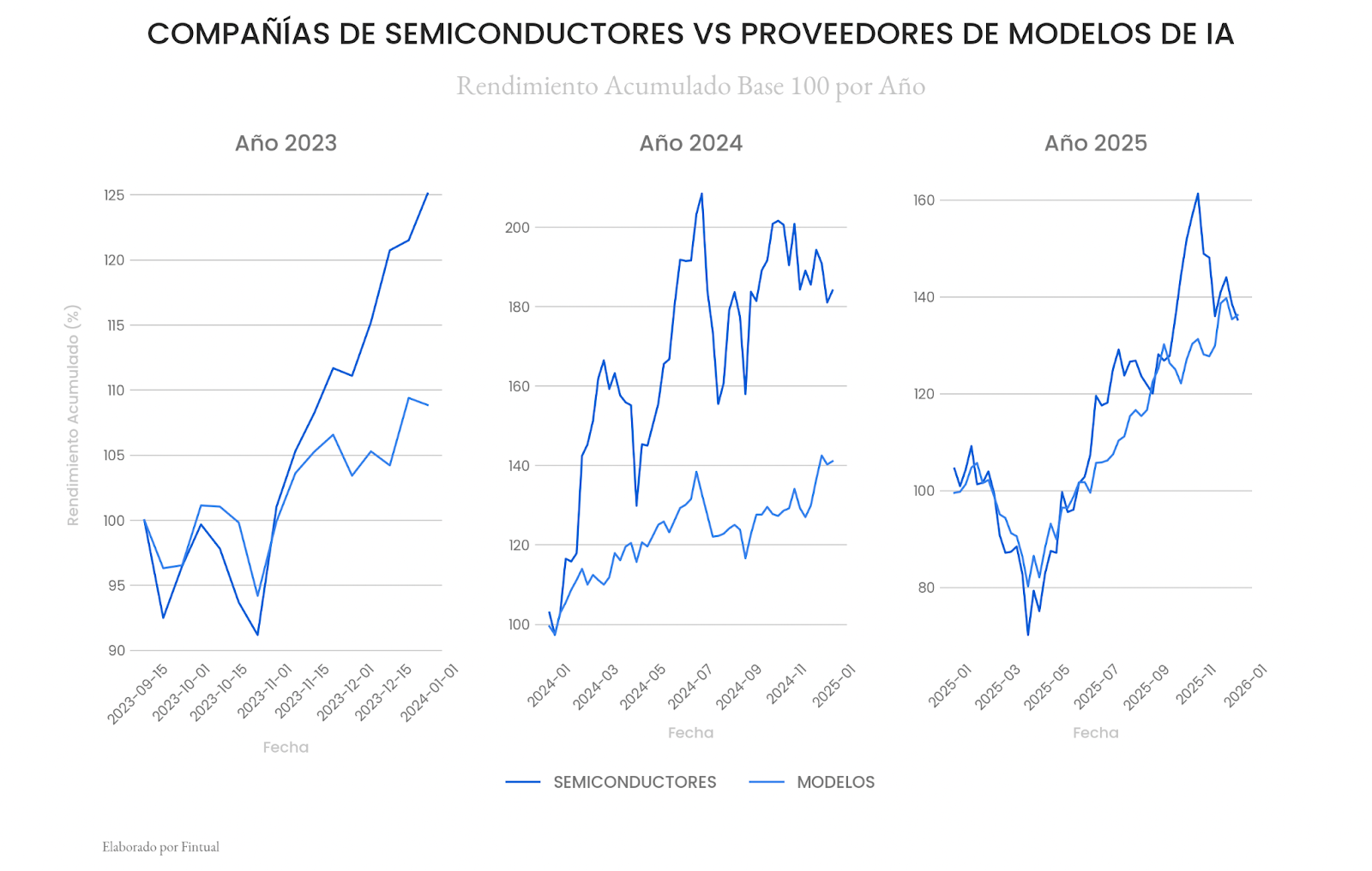 Los últimos tres años el comportamiento de los mercados ha estado fuertemente determinado por el desarrollo a gran escala de la IA. Creemos que 2025 habrá marcado un punto de inflexión hacia una segunda etapa en la evolución de esta industria. Mientras que en 2023 y 2024 las principales beneficiadas fueron las compañías que proveen el hardware necesario para el funcionamiento de los modelos —como los fabricantes de semiconductores—, en 2025 hemos visto cómo las empresas directamente vinculadas al desarrollo de modelos de IA comenzaron a incorporarse plenamente a este ciclo.