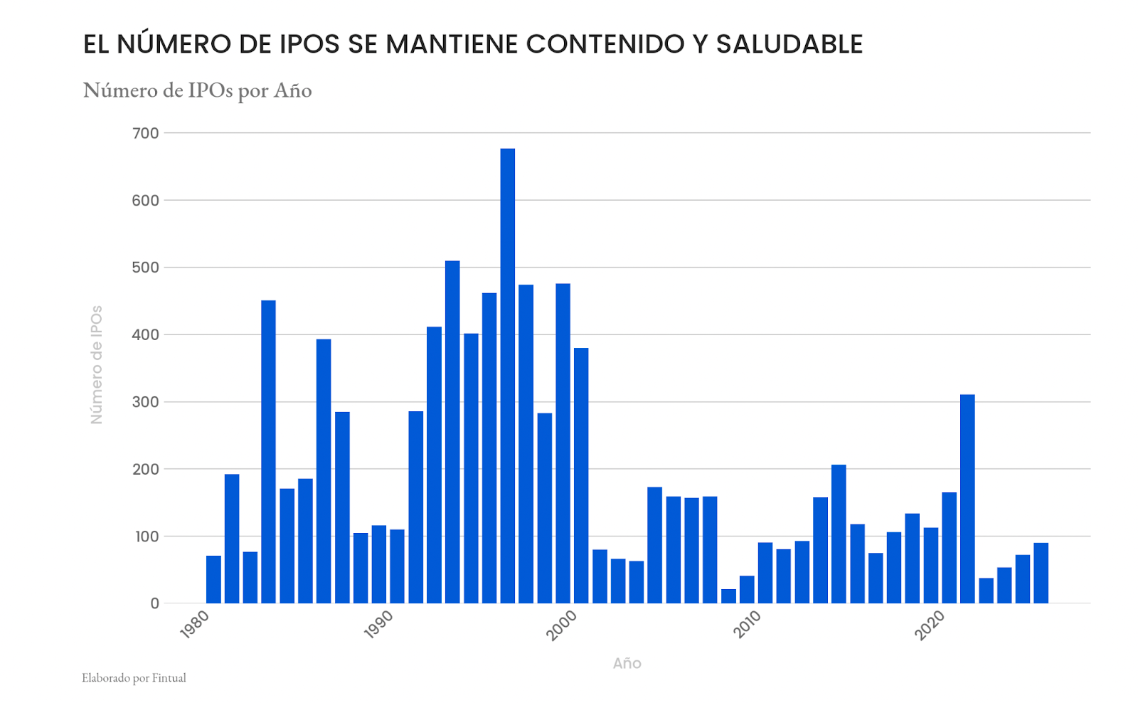 En este contexto, otra forma de ver la salud de estas empresas de tamaño medio es analizar cómo se ha venido comportando el mercado de salidas a bolsa (IPOs). En general, el volumen de ofertas públicas aún se encuentra en niveles razonablemente bajos, y muy por debajo de lo que fue en burbujas anteriores, donde empresas sin modelos de negocio ni resultados financieros eran capaces de levantar capital para sus negocios saliendo a la bolsa.