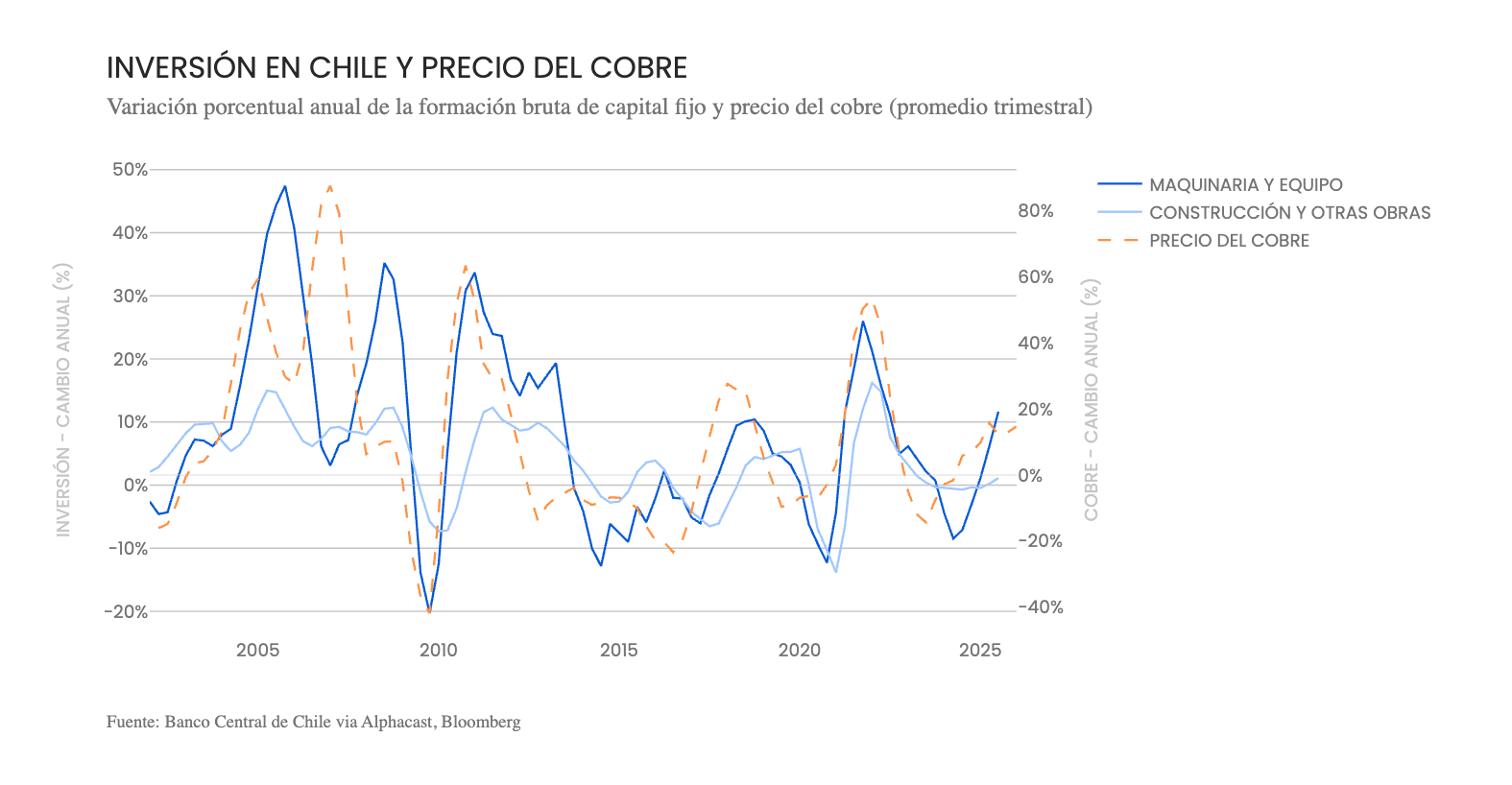 La economía cerrará 2025 con una expansión cercana al 2,3% de 2024 y un repunte de la inversión. Con la discusión constitucional cerrada y la reforma de pensiones aprobada, el país dejó atrás varios años de preguntas abiertas que mantenían frenadas las decisiones de inversión de largo plazo. La formación bruta de capital fijo creció cerca de 7%, impulsada principalmente por maquinaria y equipos vinculados a grandes proyectos mineros y energéticos.