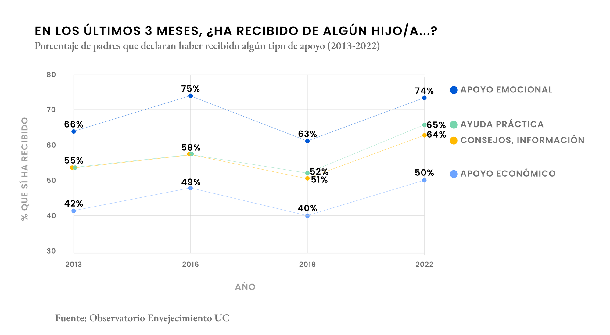 Además, según un estudio del 2020 sobre envejecimiento y apoyo de la Universidad Católica y el Observatorio de la Vejez, el porcentaje de personas mayores que requerían ayuda financiera de sus hijos aumentó de 42% en 2013 a 50% en 2022. Y todo hace pensar que esta tendencia va en alza.