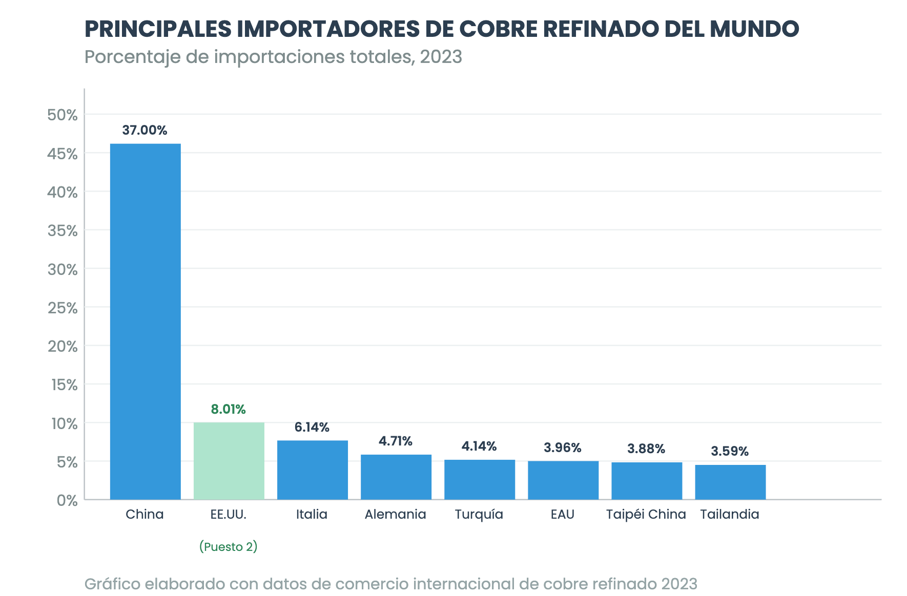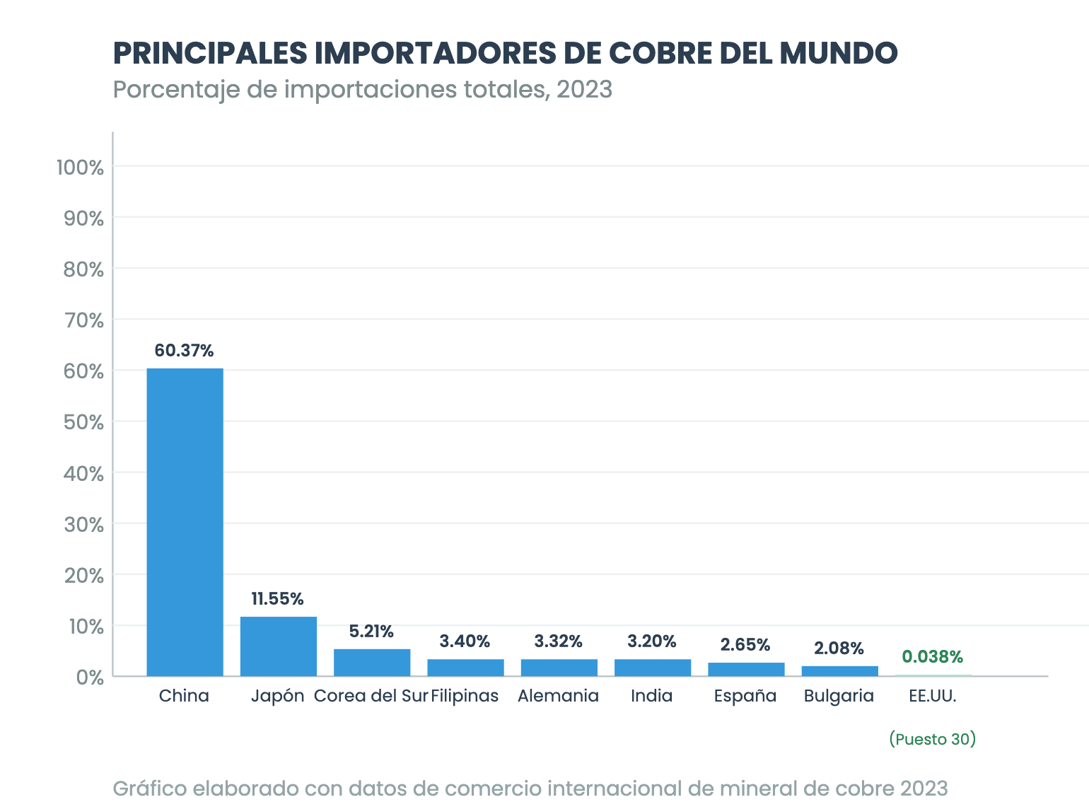 Estados Unidos es bueno para consumir en general, sí, pero no consume mucho de todos los bienes. En el caso del mineral de cobre, Estados Unidos solo importa un 0.04% del total de las importaciones mundiales. Son los países asiáticos, especialmente China, los que más podrían influir en su precio mundial.