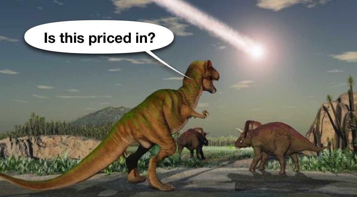Ok, el meme se ríe del análisis WIPI, y de la importancia ciega que le dan muchos analistas a este tipo de herramientas. Es un sarcasmo, el meme muestra a los dinosaurios (QEPD) viendo como se acerca el meteorito que acabará con sus vidas para siempre. Sin embargo, a ellos solo les preocupa ver si efectivamente eso ya estaba priceado en el mercado, o equivalentemente, si ya estaba incorporado en los precios para buscar alguna oportunidad de inversión.