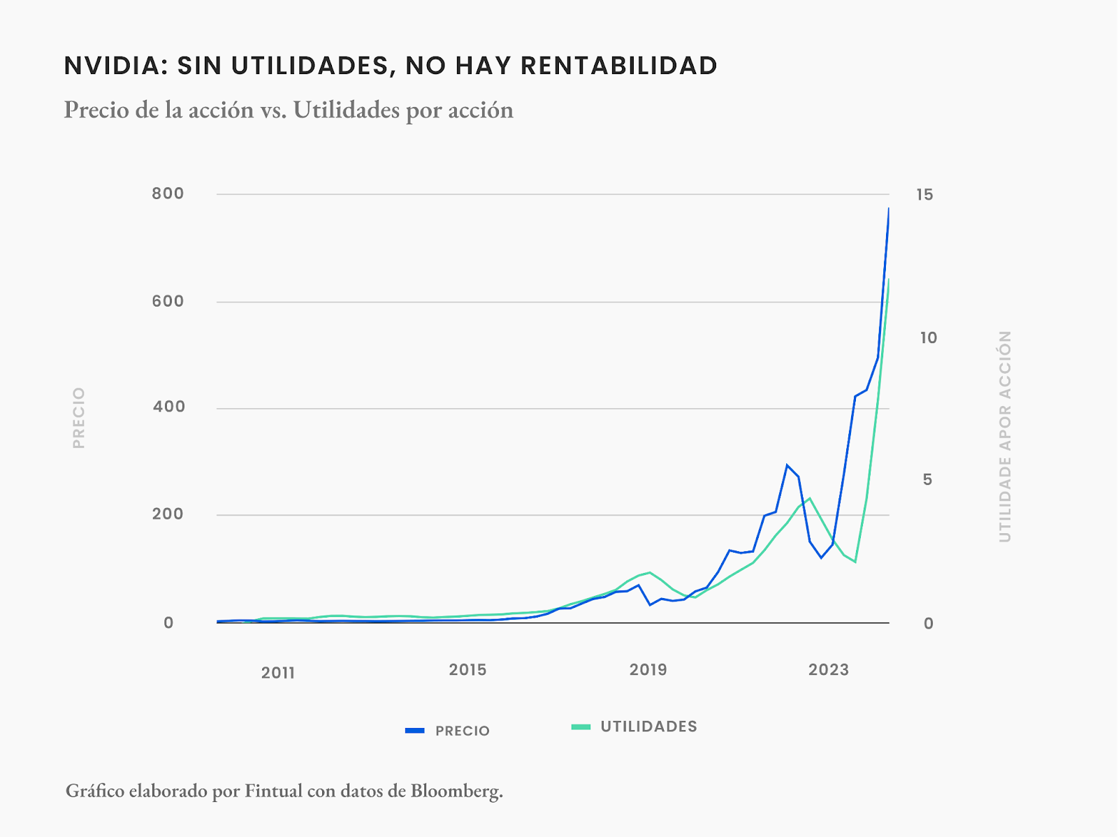 Como se ve en el siguiente gráfico, el alza en precio de Nvidia ha venido acompañada de buenos resultados financieros. En los últimos 2 años, tanto el precio de la acción como sus utilidades se han triplicado.