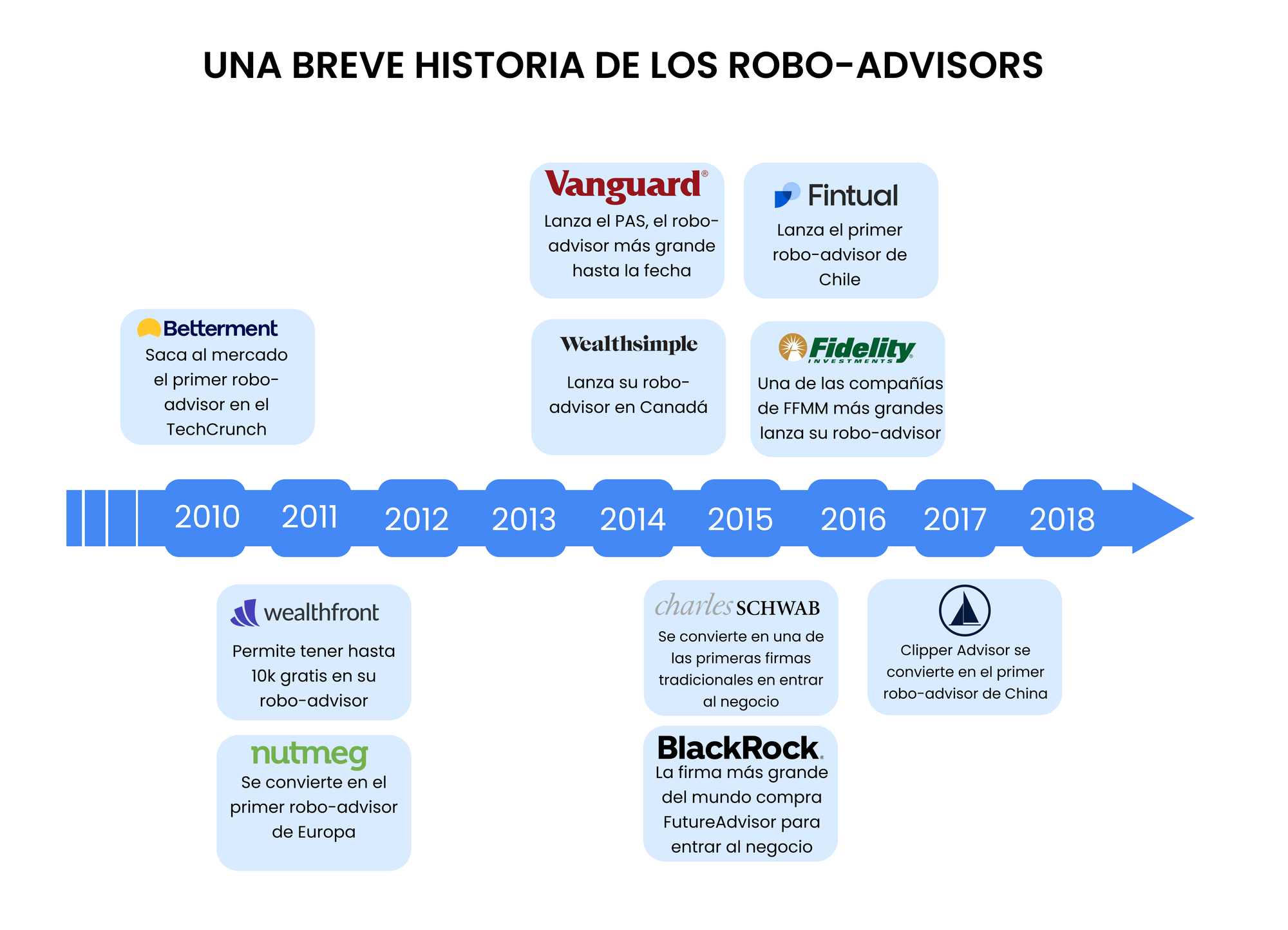 En esos años Jon Stein, fundador de Betterment, tuvo la idea de poner al alcance de cualquier persona herramientas que antes solo podían usar los wealth managers: plataformas digitales que te ayudan a gestionar tus inversiones, mediante algoritmos diseñados por expertos en finanzas, ajustando las recomendaciones de acuerdo a tu perfil de riesgo y tus objetivos particulares. Así aparecieron los robo-advisors.