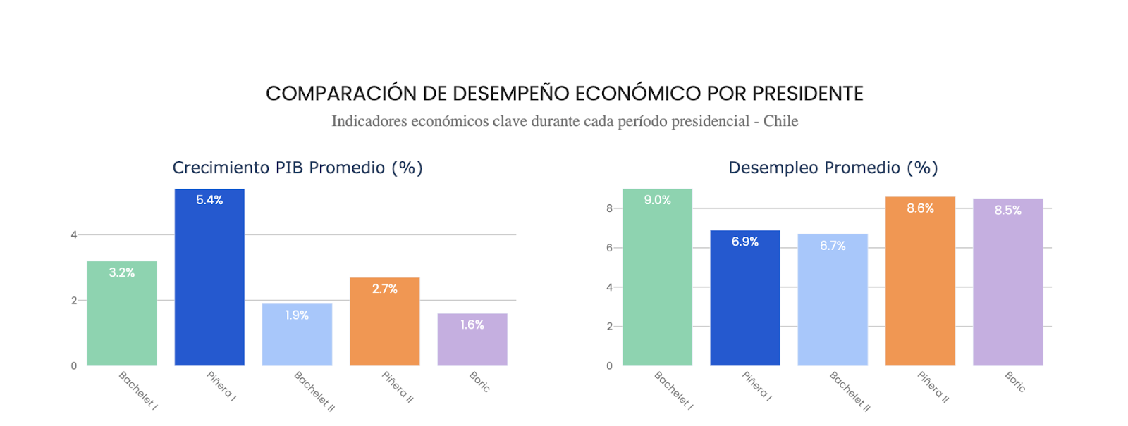 Y en segundo lugar –y esto nos gusta repetirlo– el presidente por sí solo no determina la trayectoria de la economía. Veámoslo con un ejemplo: los períodos económicos de los gobiernos de Piñera I y Piñera II fueron distintos entre sí; lo mismo ocurrió con Bachelet I y Bachelet II.