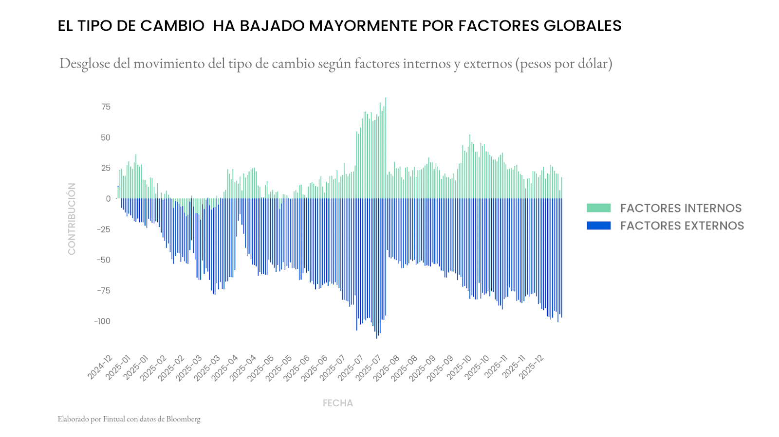 De todas maneras, el factor más relevante continuará siendo el escenario externo. En el siguiente ejercicio, utilizamos un modelo lineal para determinar qué factores han incidido más este año en el tipo de cambio en Chile. Como se puede ver, la totalidad de la apreciación se debe a factores externos.