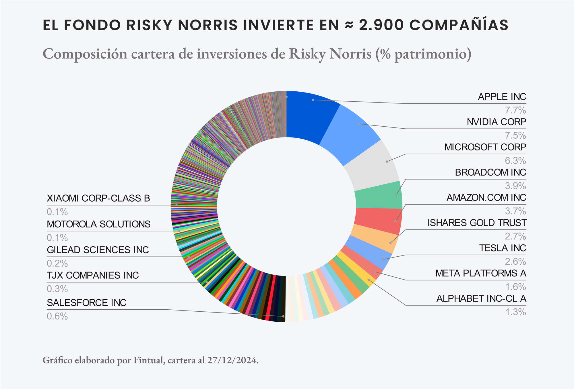 - En Risky Norris y Moderate Pitt se incluyó una nueva posición en el ETF IAUM. Este vehículo brinda exposición al precio del oro, a través de la inversión en lingotes de oro que se mantienen en custodia por parte de una entidad especializada. En el contexto actual, incluir oro en el portafolio tiene sentido debido a varias razones. Primero, la persistente inflación global y el alza reciente en la incertidumbre geopolítica hacen que el oro actúe como una cobertura efectiva contra la pérdida de poder adquisitivo de las monedas. Además, con los crecientes déficits fiscales, el oro ofrece estabilidad frente a la caída de otros activos como los bonos. Finalmente, su creciente demanda en Asia y en las reservas de múltiples bancos centrales, hacen que la posición técnica de este activo haga sentido.