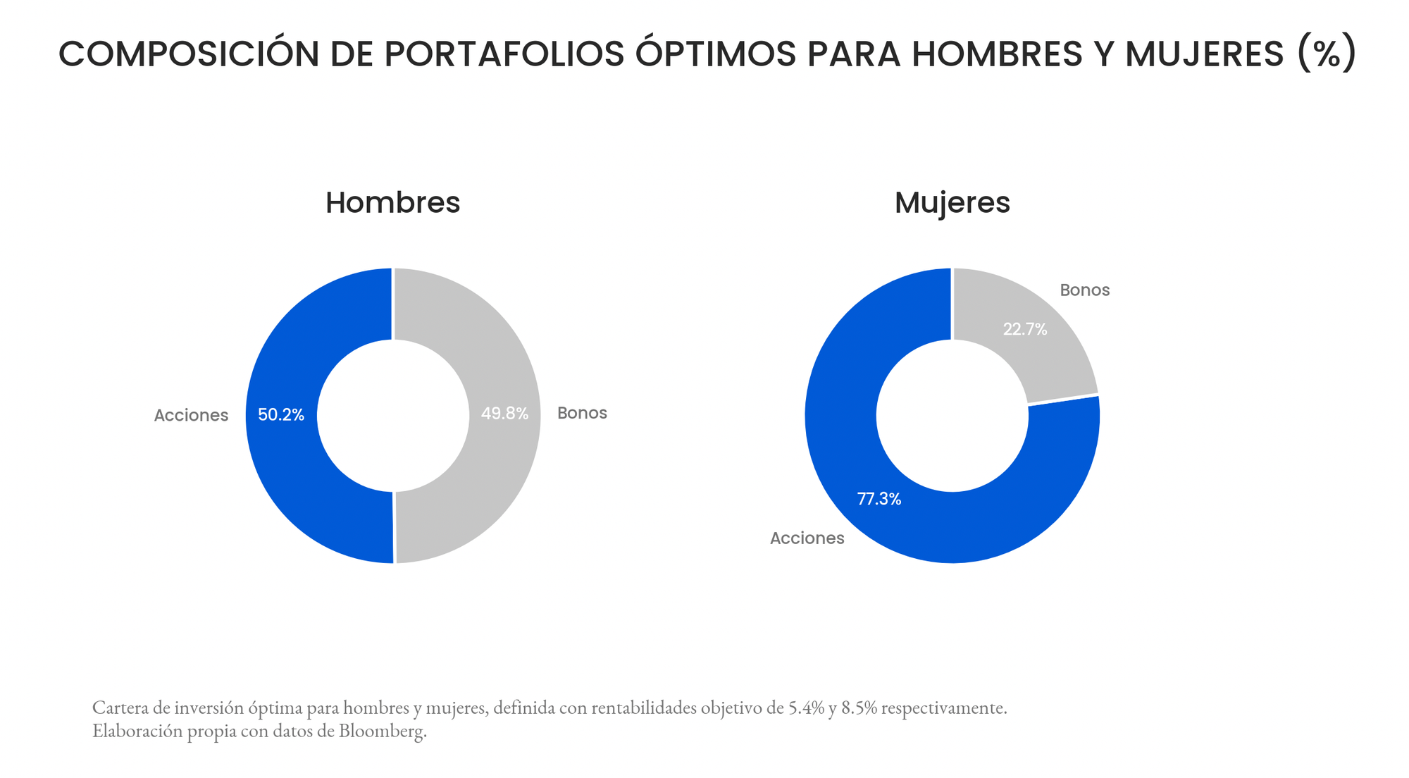 Como se observa en la figura, una cartera de inversión óptima para un fondo de pensiones de mujeres debiese presentar una mayor asignación a activos riesgosos (acciones) que la correspondiente a hombres. En particular, en este ejercicio, y bajo el supuesto de una cartera constante a lo largo del horizonte laboral, la asignación óptima para hombres sería, en promedio, cercana al 50% en acciones —similar a la trayectoria por defecto del sistema de multifondos vigente—. En cambio, para las mujeres, la asignación óptima alcanzaría aproximadamente un 77%, es decir, 27 puntos porcentuales más.