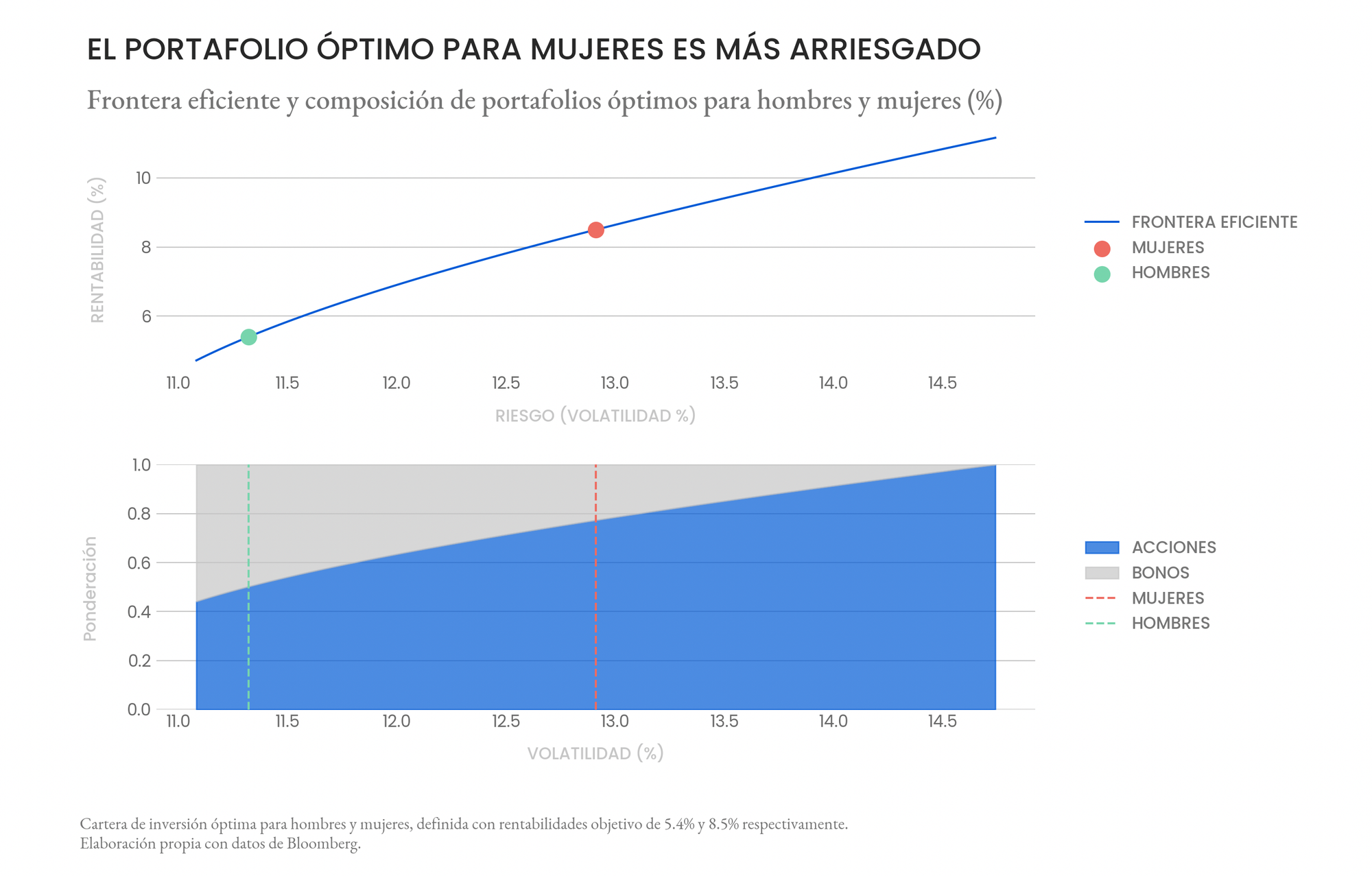 Naturalmente, distintos objetivos de rentabilidad implican carteras de inversión óptimas diferentes para hombres y mujeres. En el ejercicio que sigue, ejecutamos una rutina de optimización de portafolios para determinar la combinación óptima entre renta fija y acciones que permita alcanzar la rentabilidad objetivo presentada anteriormente.