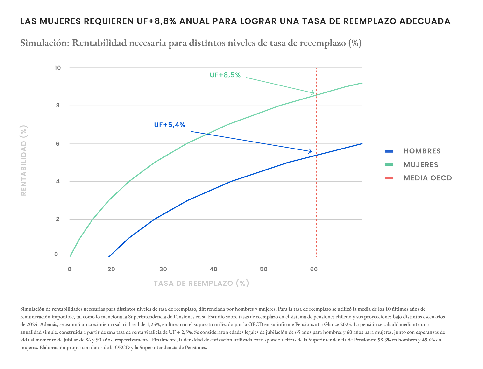 En este contexto, y en el marco de la introducción del nuevo régimen de inversiones para los fondos de pensiones, una de las pocas variables que sí puede ajustarse para mejorar las tasas de reemplazo —especialmente en el caso de las mujeres— es la rentabilidad del ahorro previsional. Dado el conjunto de factores adversos mencionados, mayores retornos de largo plazo permitirían compensar parcialmente estas desventajas y elevar las pensiones relativas.