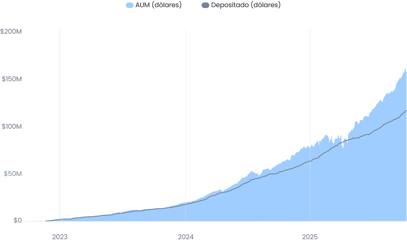 Y otro dato más: si comparamos la línea del depósito neto contra el total en activos administrados al día de hoy, nuestros clientes han ganado plata. Tiene sentido: en general el mercado accionario tiene buenos rendimientos en el largo plazo.