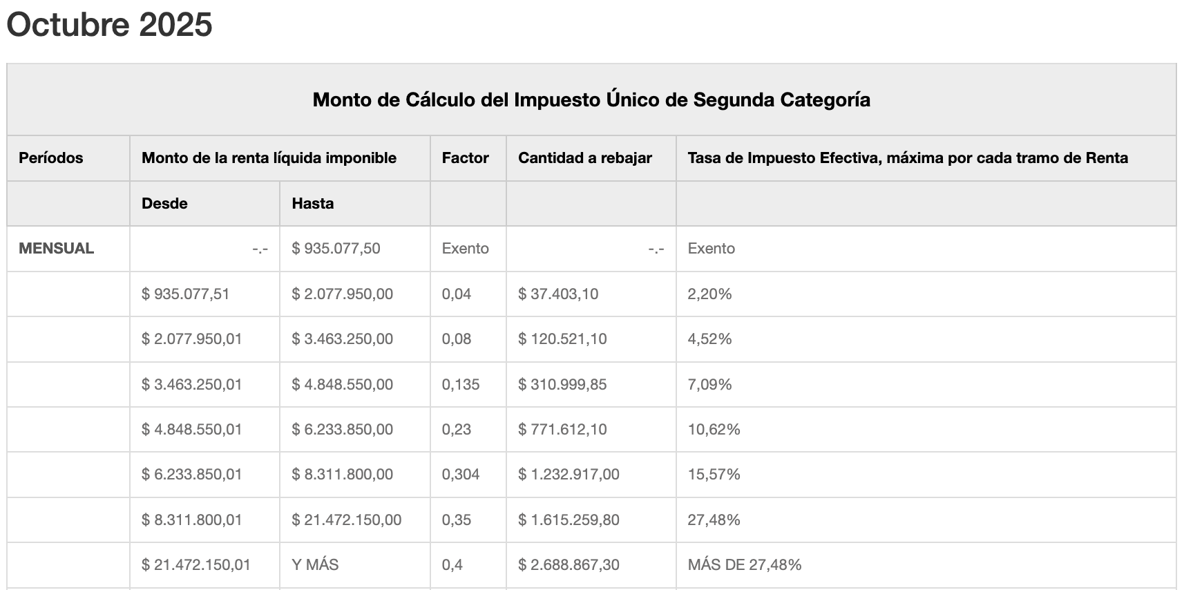 - Tasa marginal de impuesto: según la tabla de impuestos de segunda categoría publicada por el SII (la imagen anterior, de la tabla para octubre del 2025), la tasa marginal máxima es del 0,4 (aparece en la columna llamada “Factor”). Esto significa que por cada peso adicional que gane una persona en ese tramo de ingresos, deberá pagar 40% de impuestos de ese extra, es decir, 0,4 pesos.