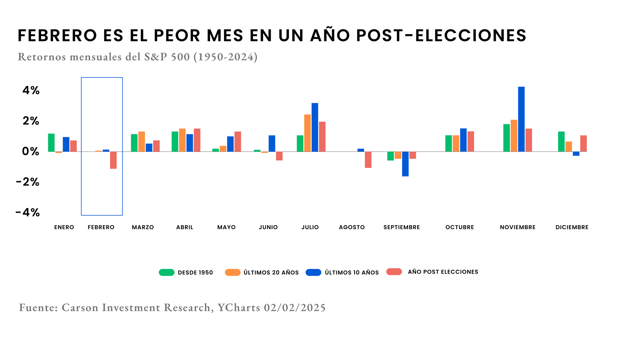 Un dato algo anecdótico pero particularmente interesante es el comportamiento del S&P 500 durante años posteriores a las elecciones presidenciales. Como muestra el gráfico, históricamente el mercado suele experimentar “frustración” durante los primeros meses después de una elección.