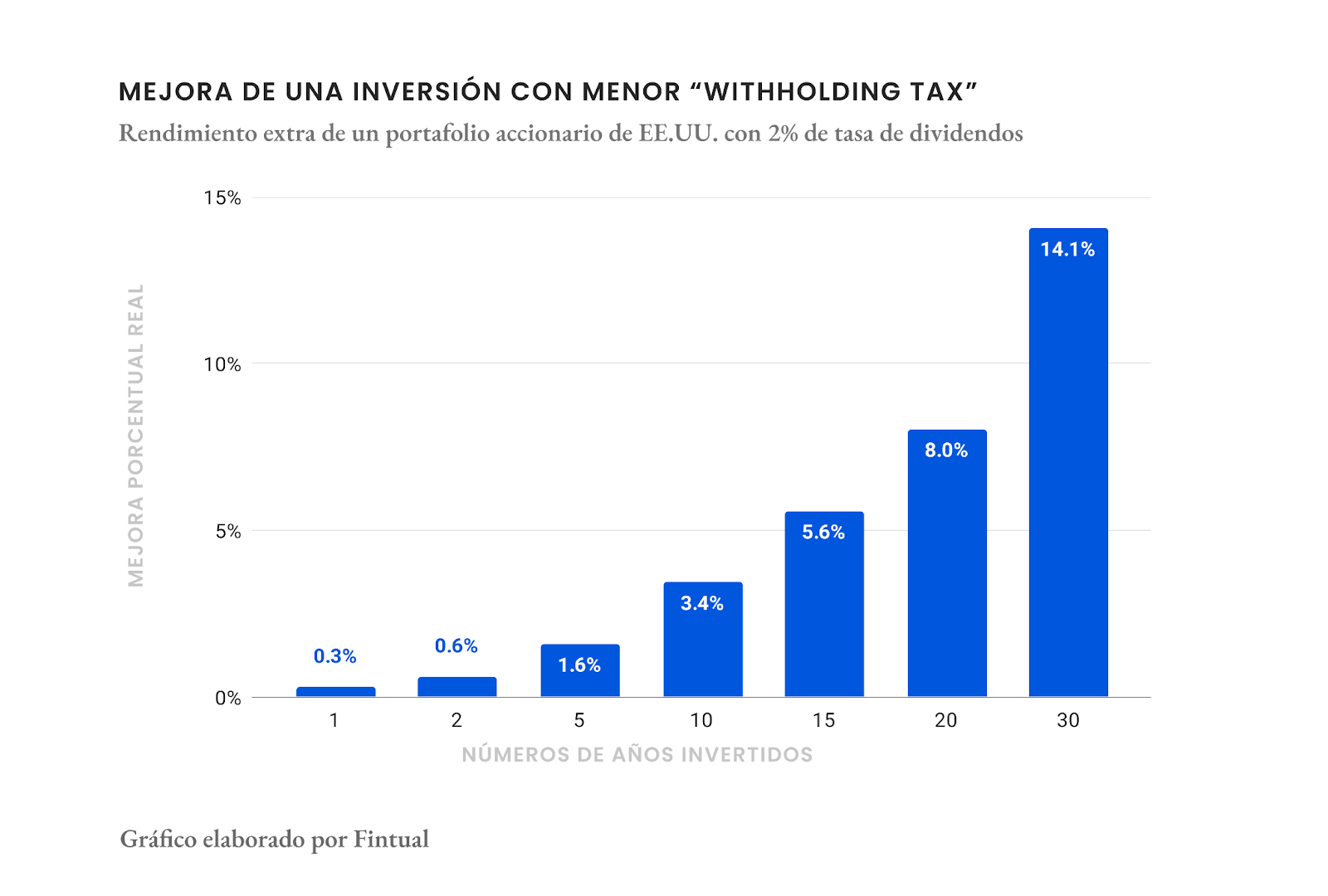 Esta reducción es igualmente beneficiosa para tus inversiones en acciones y ETFs domiciliados en EE.UU. La disminución de la tasa de withholding tax aumenta los rendimientos netos de estas inversiones, permitiendo una mayor proporción de las ganancias generadas por dividendos de acciones y ETFs estadounidenses que permanezcan en tu cartera de Fintual Acciones.