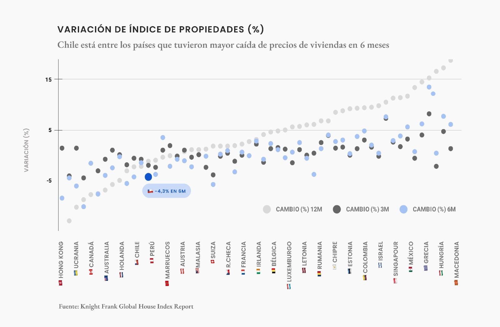 Y comparándolo con el resto del mundo, se encuentra dentro de los países con mayores caídas en los precios de las viviendas. En un ránking de 56 países, Chile está dentro de los 7 países con mayores caídas de precios en los últimos 6 meses.