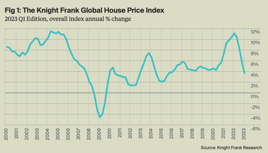 Según un informe realizado por Knight Frank con datos del primer trimestre del 2023, el índice mundial de precios de viviendas ha estado aumentando a su tasa anual más lenta desde el tercer trimestre de 2015, y ha caído desde su punto máximo de crecimiento del 11,1% en el año hasta el primer trimestre de 2022, cuando los mercados mundiales experimentaron un auge tras la pandemia.