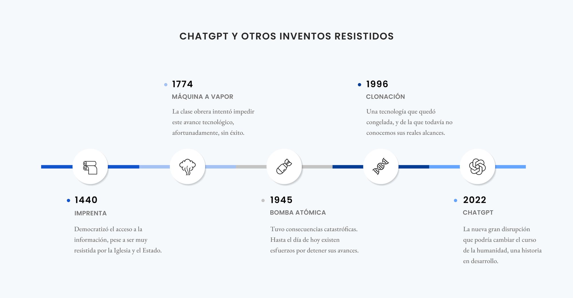 Y si bien ChatGPT es algo nuevo (se puede argumentar que la tecnología por detrás existe hace varios años, pero como producto con tal masividad no existía), el hecho de tener una innovación que cause temor y que levante mucha oposición, es algo tan antiguo como la humanidad misma.