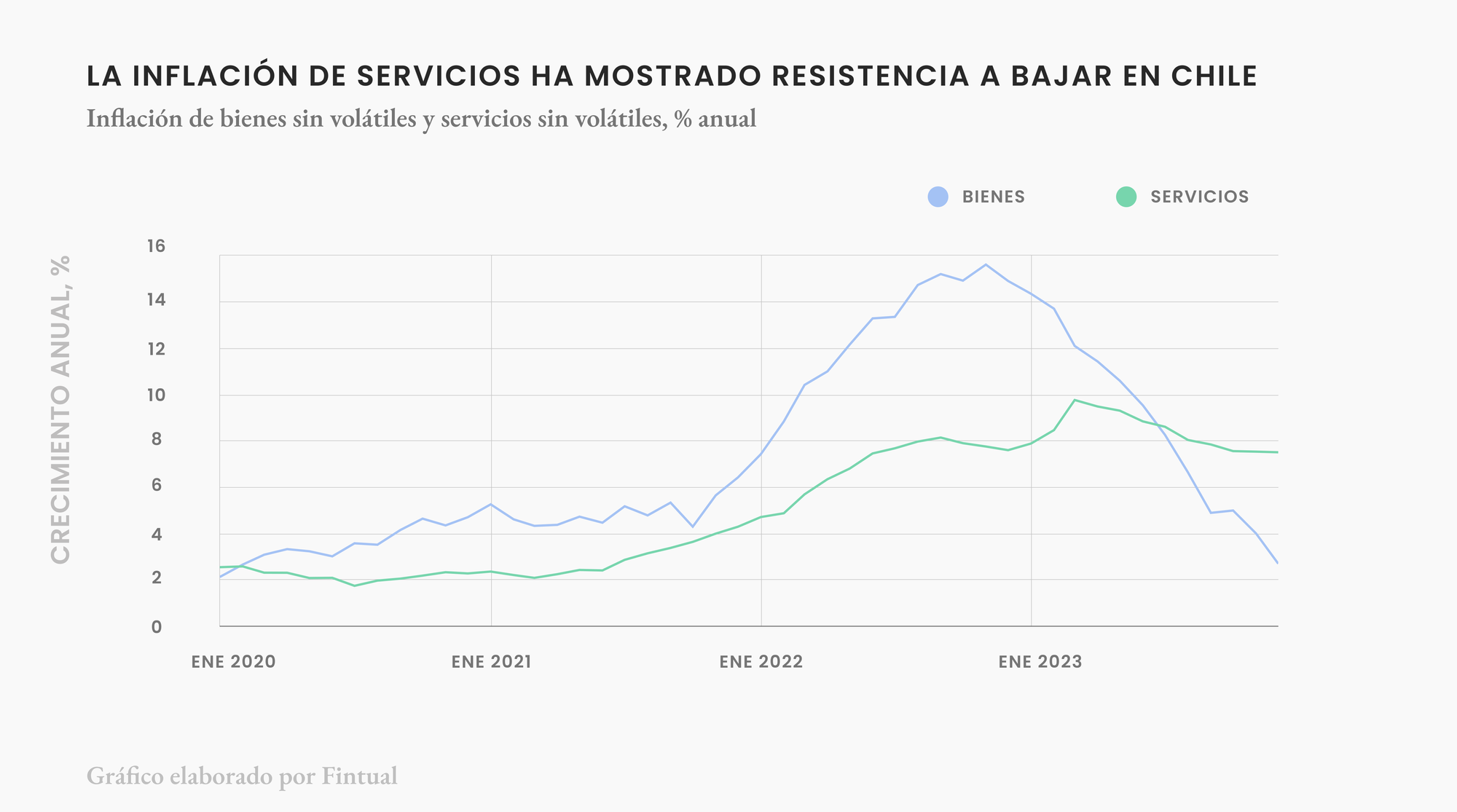 Entonces, dentro del IPC sin volátiles, la inflación anual del subíndice de bienes ha caído casi 13 puntos porcentuales desde su peak, mientras que el subíndice de servicios ha caído poco más de 2 puntos porcentuales.