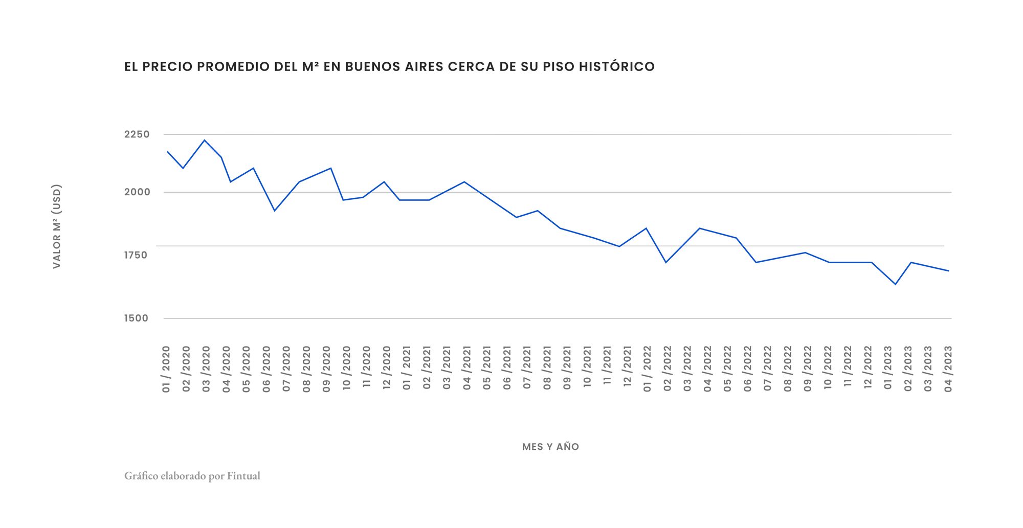 Los precios inmobiliarios en Buenos Aires están muy cerca de su piso histórico. Las propiedades en la ciudad de Buenos Aires han bajado entre un 30 y 35% desde el año 2018 a la fecha, y entre un 40 y 50% en los suburbios que rodean a la ciudad, lo que se conoce como el Gran Buenos Aires.