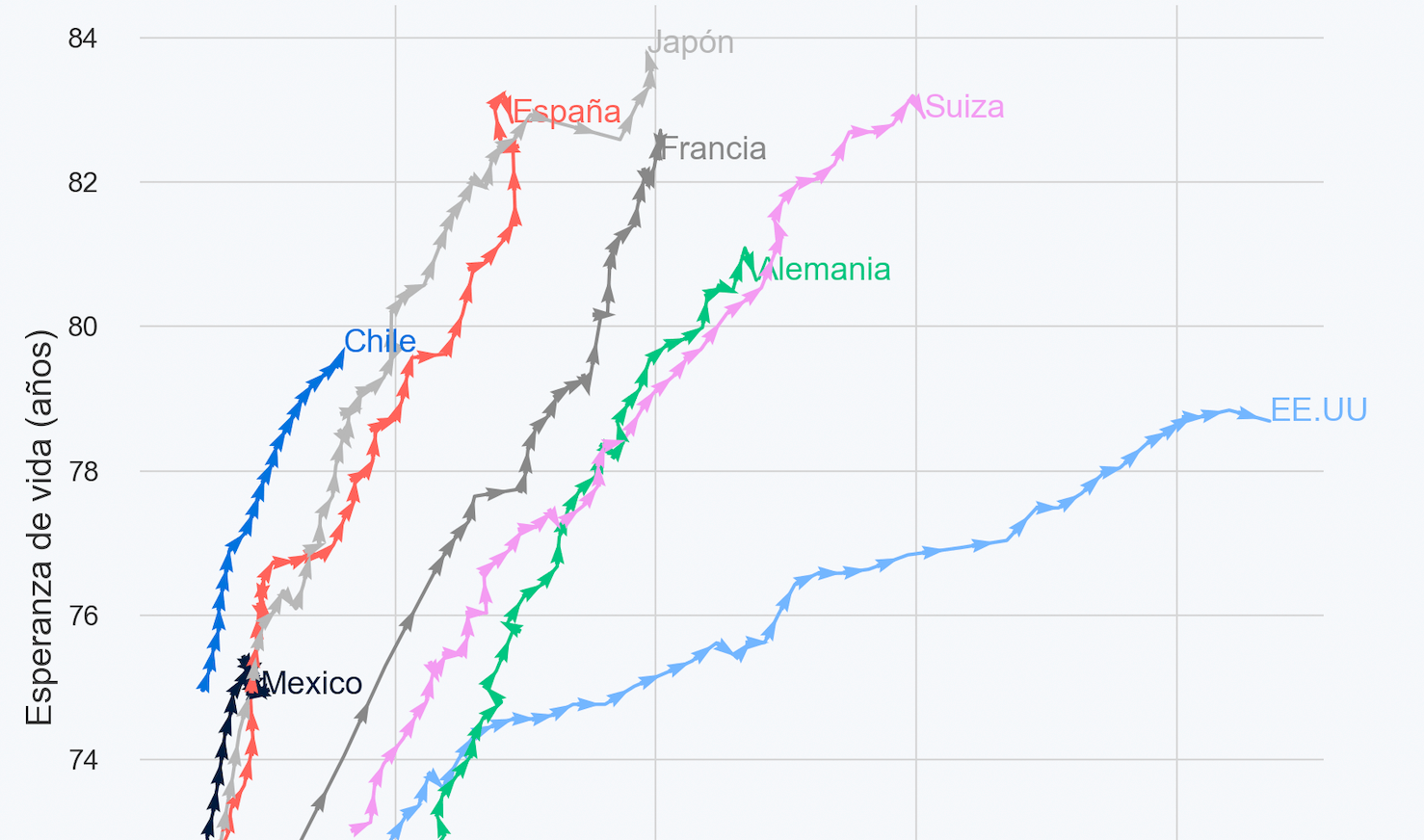 Como se puede observar en la figura, todos los países de la muestra han aumentado su gasto en salud, y de la mano de este gasto han mejorado su esperanza de vida. Si bien este resultado es esperable, no todo es gasto. La esperanza de vida también varía en función de otras variables y hábitos que tienen las personas. En particular, viendo el gráfico, llama la atención el comportamiento de la esperanza de vida de Estados Unidos.