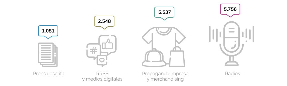 La glosa de propaganda en redes sociales y medios digitales alcanzó un total de $2.548 millones de pesos mientras que la prensa escrita y digital sumó a su bolsillo $1.081 millones. En total, las radios superaron en más de 2 mil millones de pesos a sus contrincantes digitales y a la prensa escrita.