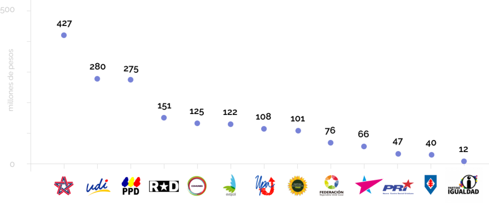 Los aportes en especies o servicios por partido político alcanzaron los $1.830 millones de pesos en total, siendo Renovación Nacional el primer lugar con $427 millones.
