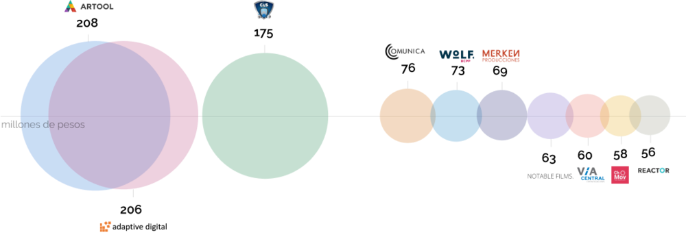 En quinto lugar de la lista con 73 millones está la agencia de publicidad Wolf BCPP, luego la productora de eventos Merkén, seguido por la Sociedad Silva y Bacigalupe, de la cual forma parte Alfredo Silva Valenzuela, dueño de Notable Films, una productora audiovisual y publicitaria.
