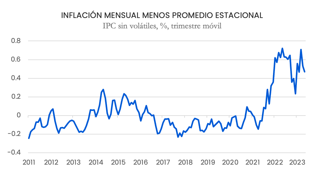 Una forma que a mí me gusta es comparar los cambios en los precios con lo que típicamente varían en ese mes en particular. Es decir, ver si la inflación mensual es atípicamente alta o atípicamente baja. Si es atípicamente alta por varios meses probablemente sobrepasará la meta del Banco Central, que es de 3%.