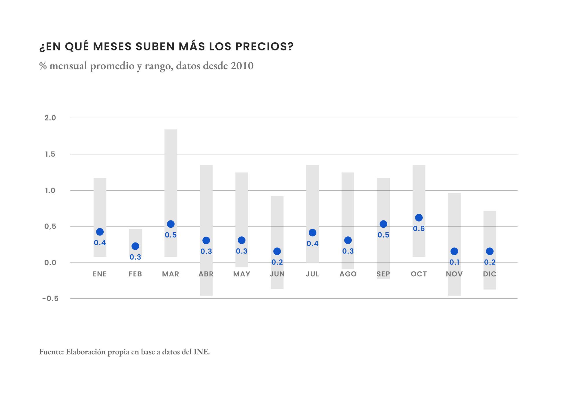 En el otro extremo están marzo, septiembre y octubre, meses típicamente de alta inflación. En estos tres meses suele subir el precio de frutas y verduras frescas, y la comida en general. Además, en marzo se ajusta el precio de la educación, y en septiembre y octubre sube el precio de algunos servicios, en especial transporte. La guinda de la torta en octubre es que sube también el precio del alcohol porque se acaban las promos del 18.