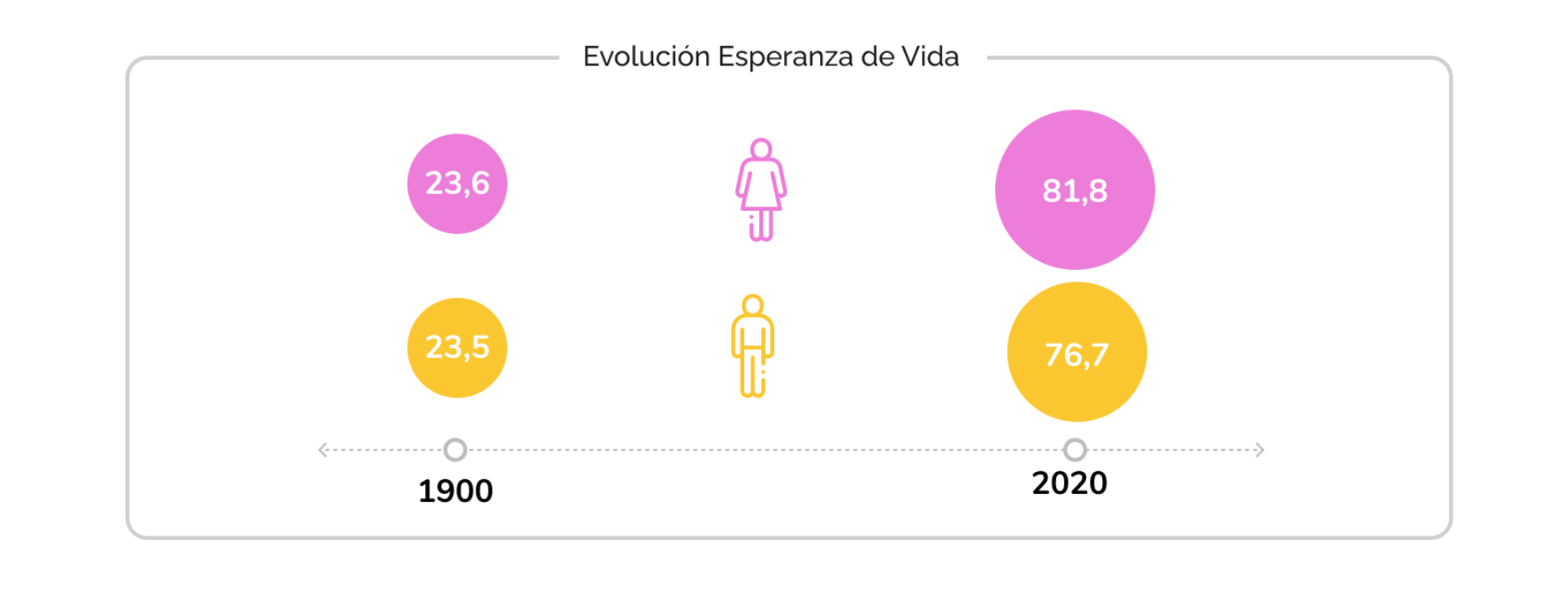 Según los datos del INE, en 1900 se estimaba un promedio de 23,6 años para las mujeres y 23,5 años para los hombres, mientras que un siglo después —para ser más exactos entre 2015-2020— este indicador alcanzaba los 82,1 años para las mujeres y los 77,3 para los hombres.