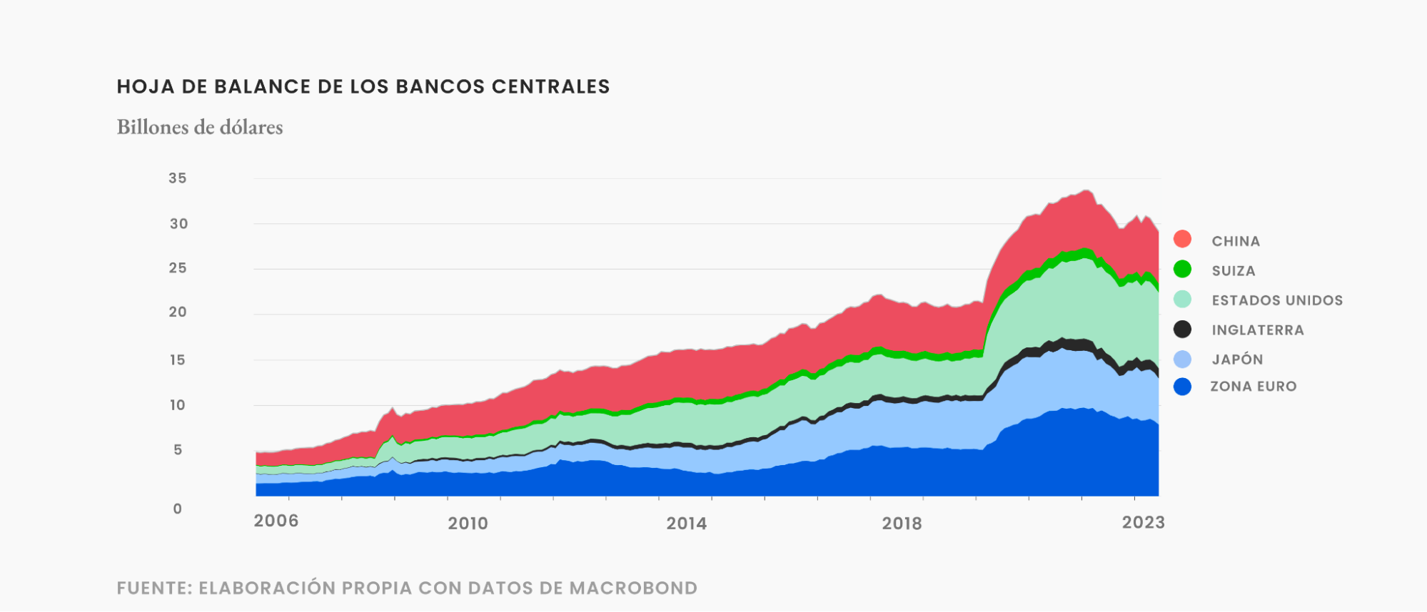Y es que quienes prestaron gran parte de la plata que los gobiernos de países desarrollados tomaron prestada fueron los Bancos Centrales, a través de sus programas de expansión cuantitativa (o QE, por sus siglas en inglés). Los Bancos Centrales entregan plata (que es pasivo para ellos) a cambio de valores (que son activos para ellos). El tamaño de sus balances aumenta y así inyectan liquidez a la economía.