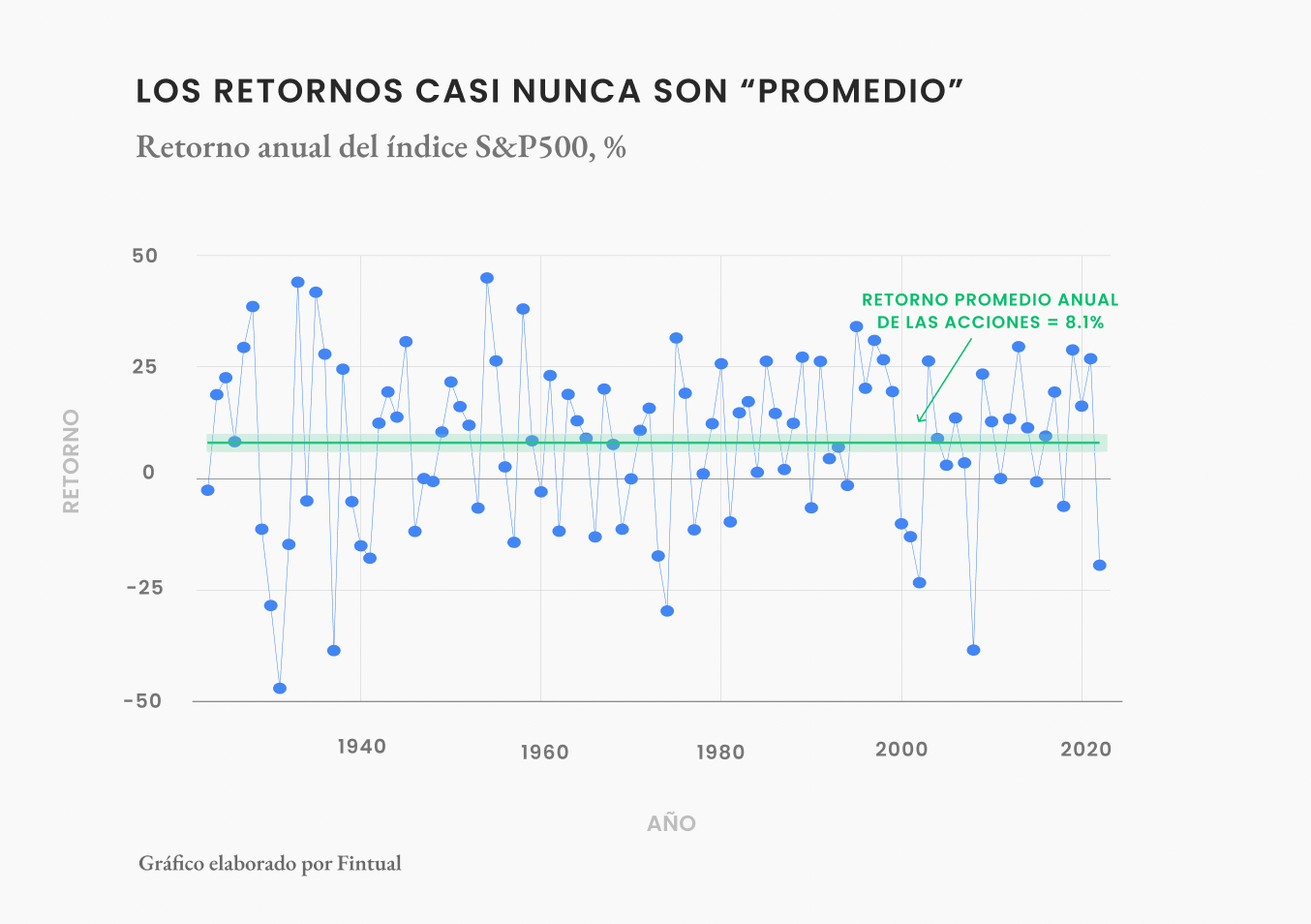 Pero la verdad es que, como esta gráfica del índice S&P500 muestra, los retornos muy rara vez están cerca del promedio.