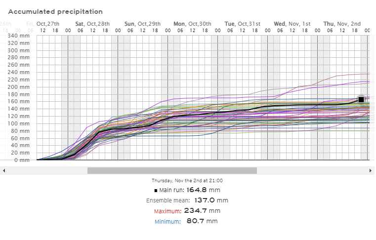 La imagen siguiente muestra la acumulación de precipitaciones según ECMWF para Lonquimay hasta el 2 de noviembre del ‘23 a las 21:00, según la corrida de la medianoche del 24 de octubre (aquí la corrida en el momento en que usted lea esto; guarde la URL si aspira a graduarse de la pobreza de las app por defecto de su teléfono para convertirse en un aficionado pro). El main run arroja 164,8 mm, y el ensemble mean (el promedio de todas las corridas secundarias) 137,0 mm. El rango va desde 80,7 a 234,7, lo que indica que casi casi con seguridad estará al menos dentro de ese rango.