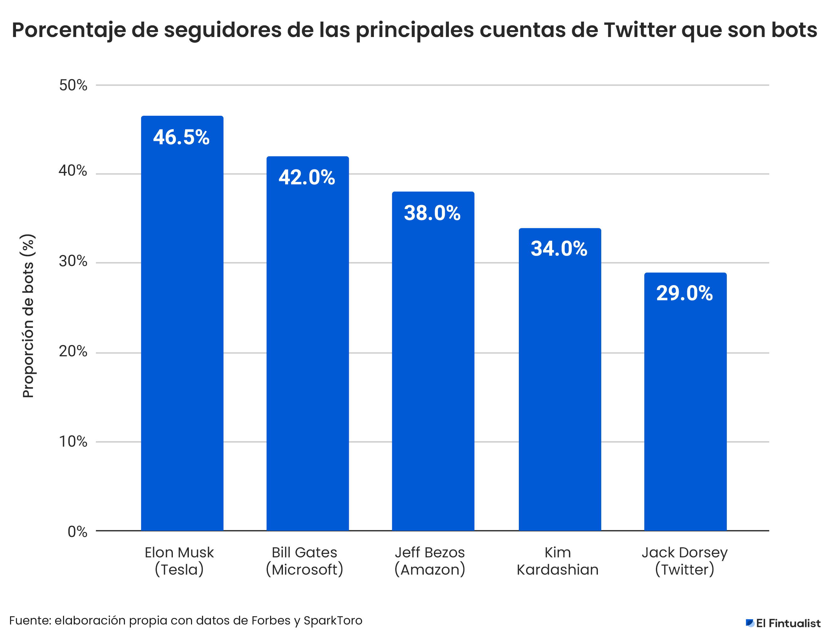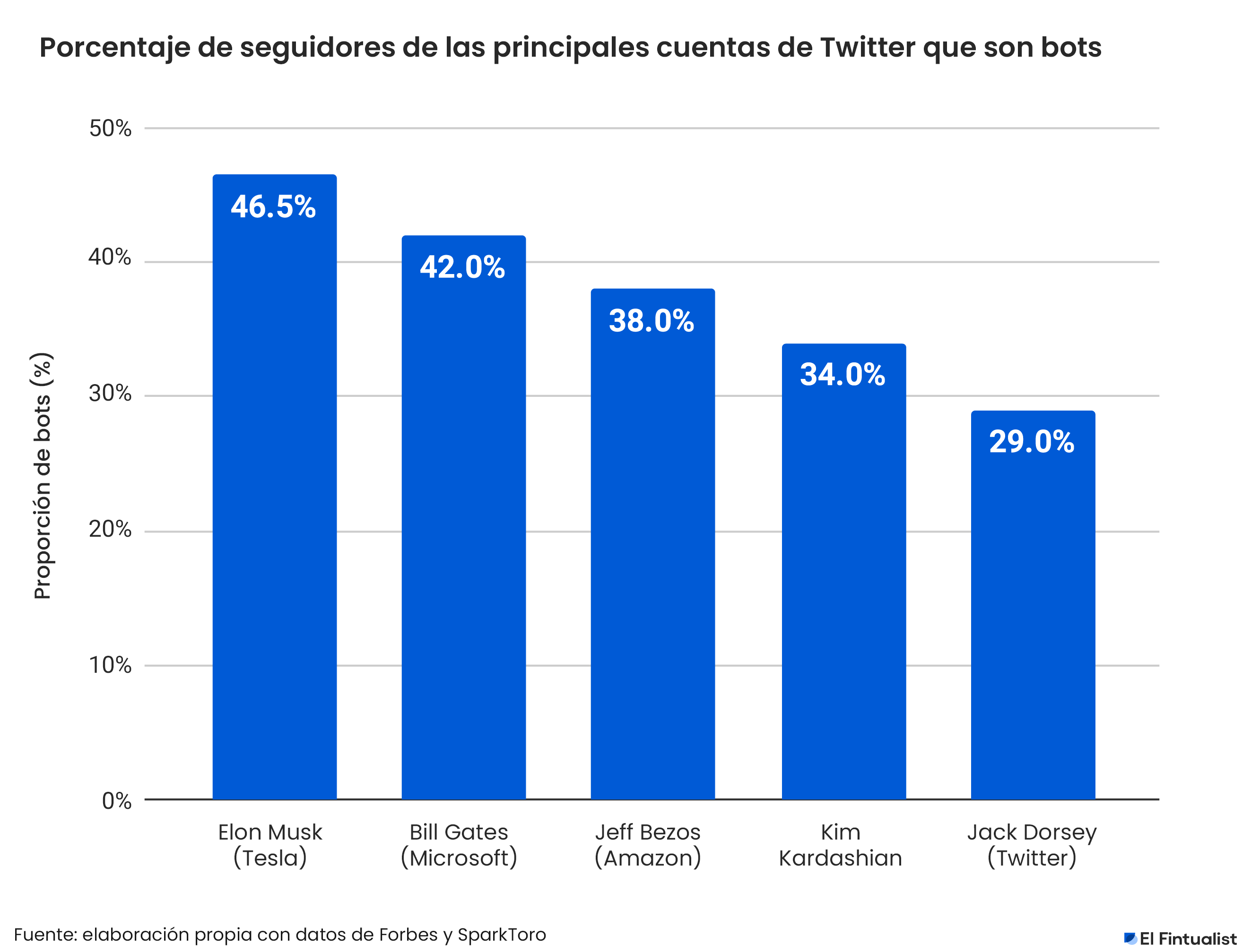 Acá vemos que el problema es masivo. Incluso en el caso de Elon Musk, casi la mitad de sus seguidores son bots.