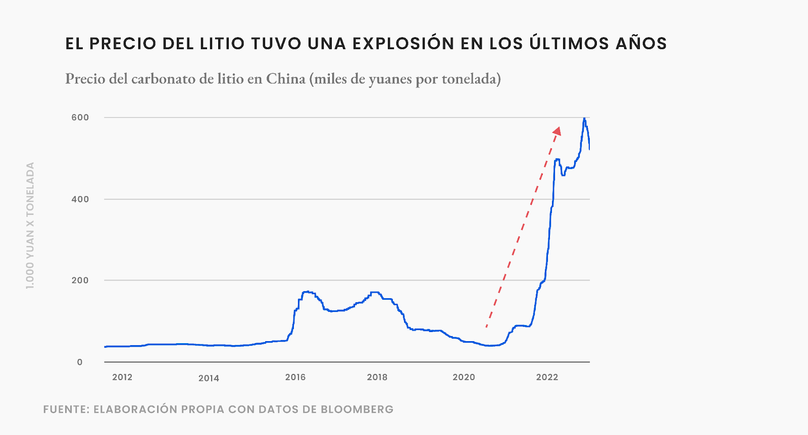Tuvieron que pasar 28 años para que el litio ganara la popularidad que tiene hoy. En 2019, John B. Goodenough, M. Stanley Whittingham y Akira Yoshino recibieron el Nobel de química y dieron origen a un nuevo tipo de batería automotriz: la batería de ión de litio (en realidad la habían descubierto hace harto tiempo, pero en esos años se hizo más popular). La gracia de esta batería es que permite almacenar 5 veces más energía que las baterías de plomo y ácido (las típicas que usan los autos). De esta manera, los autos eléctricos desbloquearon la posibilidad de tener una autonomía competitiva en relación a la de los autos comunes, sin aumentar el peso del vehículo. Si a esto le sumamos que los autos eléctricos contaminan sustancialmente menos que los autos a combustión, además de ser más baratos de conducir (la bencina es más cara que la electricidad), el resultado fue que el mercado de autos eléctricos logró definitivamente despegar. Y con él, el precio del litio: