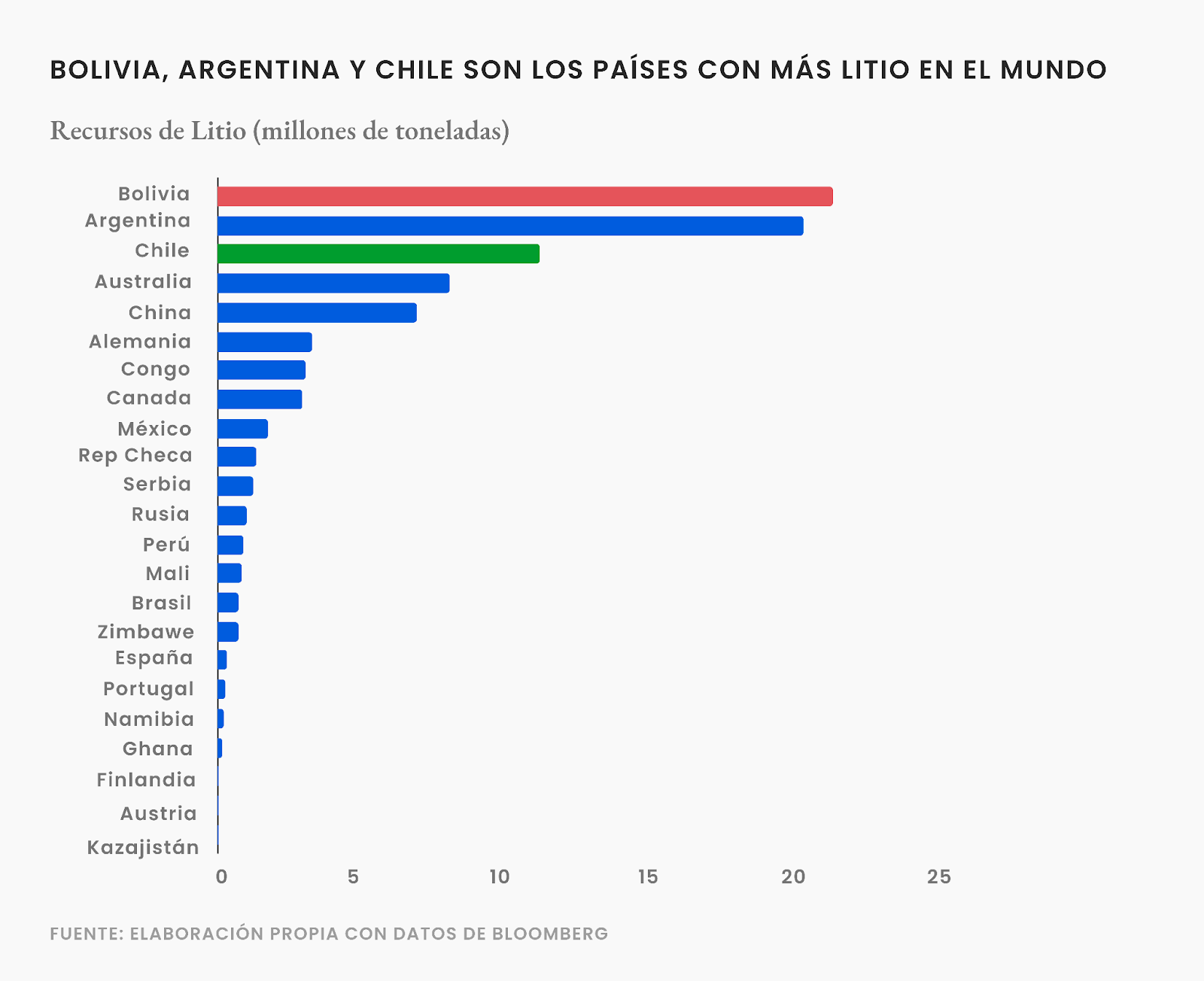 Otro punto relevante, es que el litio como recurso es muy abundante en el mundo, sin embargo no en todas partes es factible extraerlo o no se han hecho los estudios ni la exploración necesaria para evaluar su producción. Un ejemplo claro es Bolivia que cuenta con la mayor cantidad de litio del mundo, pero no lo extrae.