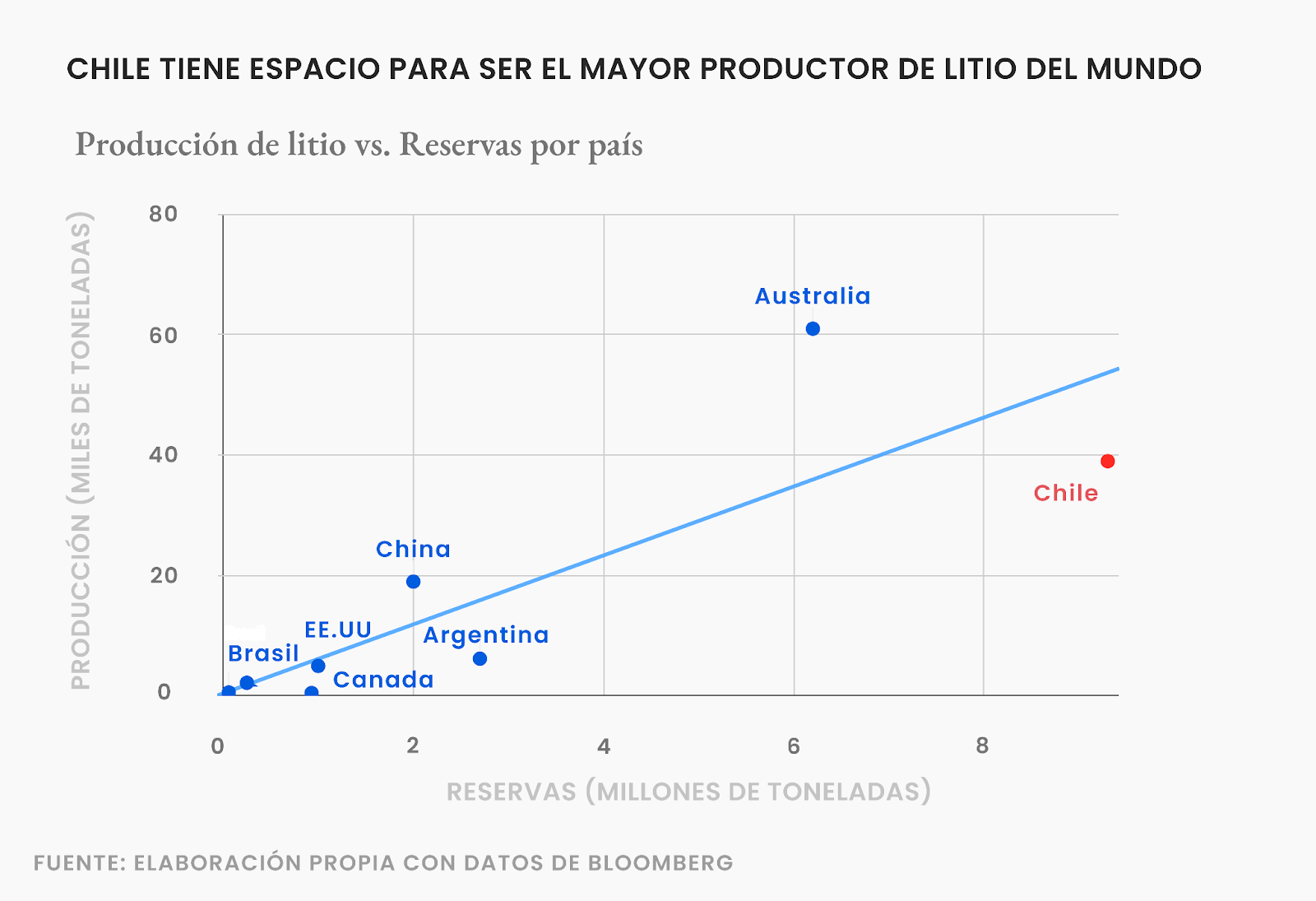 Como se ve en la figura, para los niveles de reservas de litio que tenemos en Chile, deberíamos estar produciendo bastante más. Chile cuenta con 59 salares con reservas de litio, de los cuales al menos 8 son económicamente factibles de explotar, y hoy prácticamente todo lo que exportamos sale del salar de Atacama.
