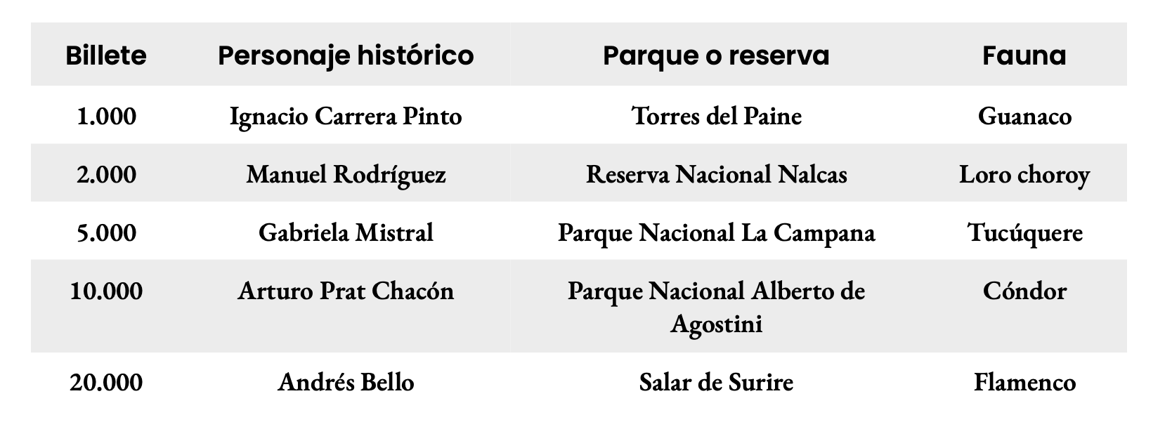 En primer lugar, recordemos que todos los billetes chilenos tienen 3 elementos característicos: un personaje histórico, un parque o reserva nacional y un animal propio de la fauna chilena.
