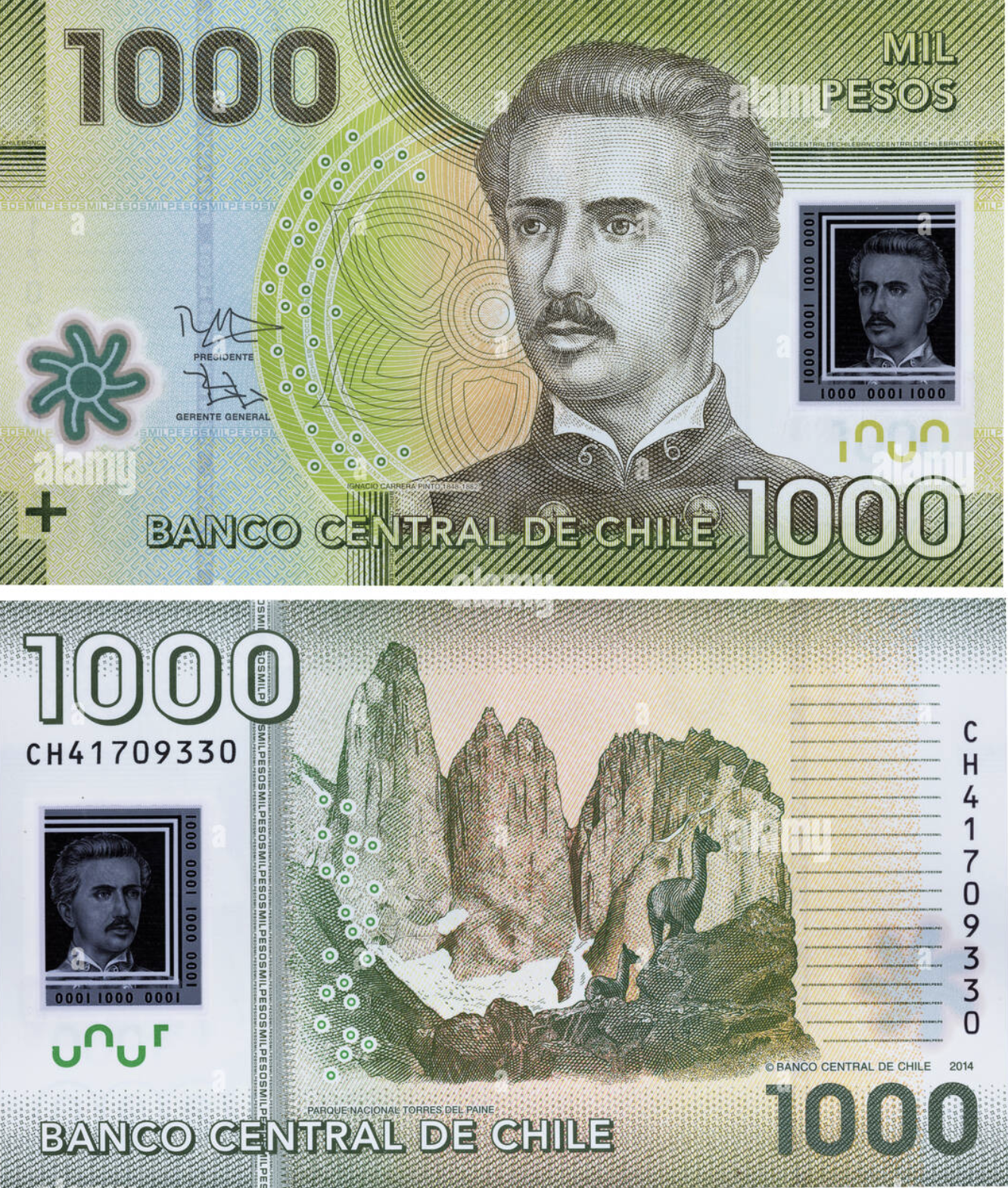 Por ejemplo, el billete de luca, tiene a Ignacio Carrera (héroe de la guerra del Pacífico), las Torres del Paine y al guanaco.