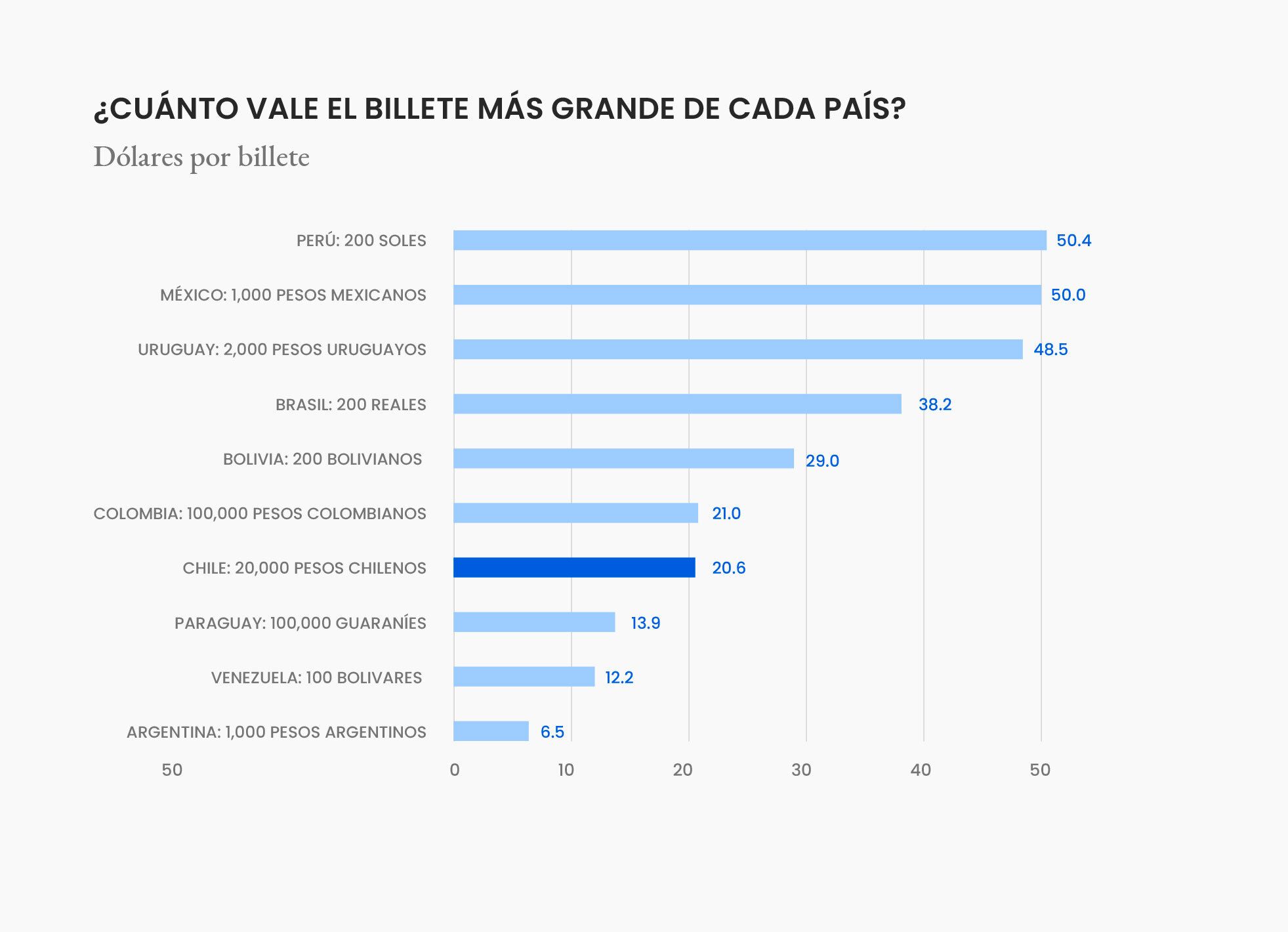 No hay una fórmula mágica para saber cuándo emitir un nuevo billete, pero un ejercicio que puede darnos pistas es compararnos con el resto de la región. En el siguiente gráfico se muestra cuánto vale el billete más grande en los países de sudamérica, todos expresados en dólares.