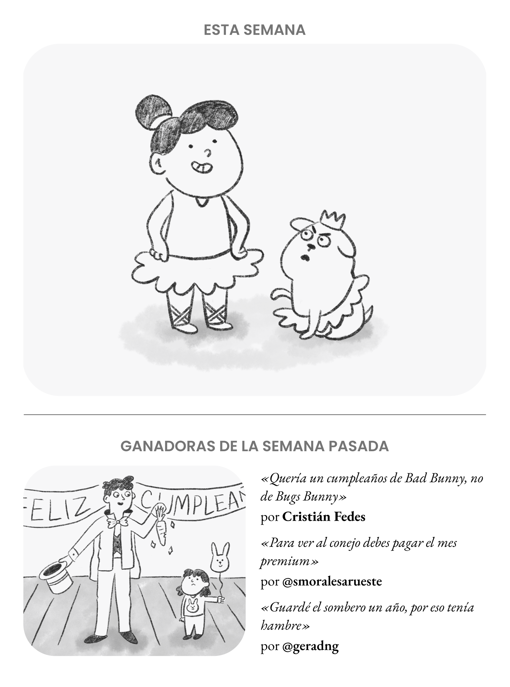 Cada semana pondremos una caricatura sin texto. Responde a este correo inventándole una frase o diálogo como bajada al dibujo. La próxima semana publicaremos las ganadoras.