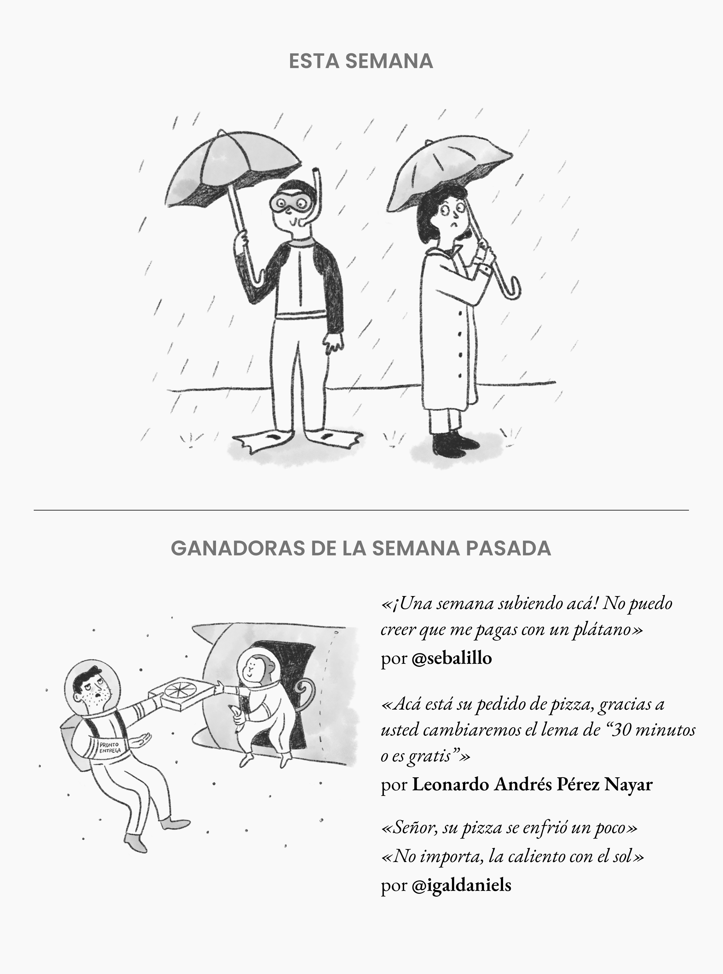 Cada semana pondremos una caricatura sin texto. Responde a este correo inventándole una frase o diálogo como bajada al dibujo. La próxima semana publicaremos las ganadoras.