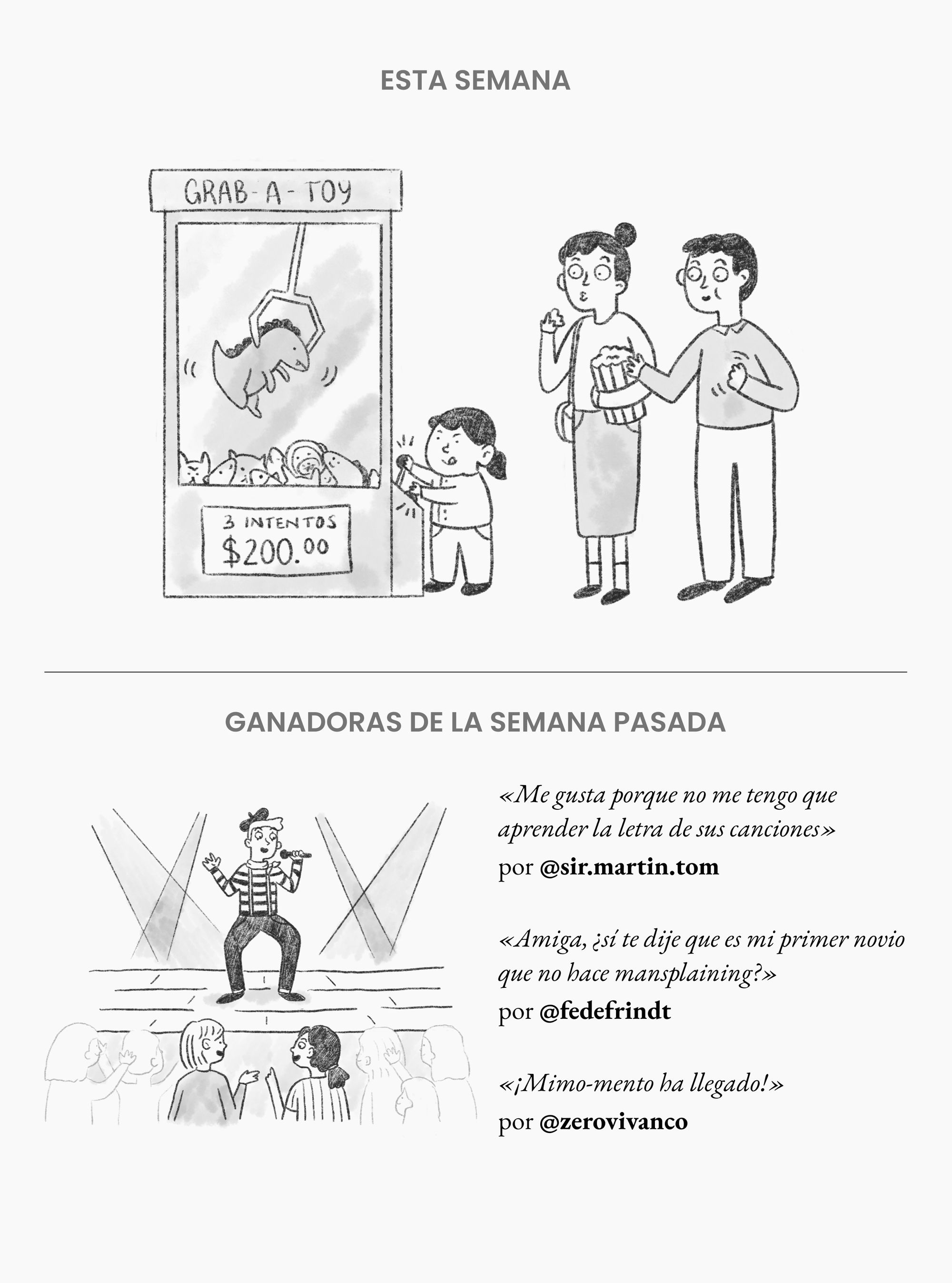 Cada semana pondremos una caricatura sin texto. Responde a este correo inventándole una frase o diálogo como bajada al dibujo. La próxima semana publicaremos las ganadoras.