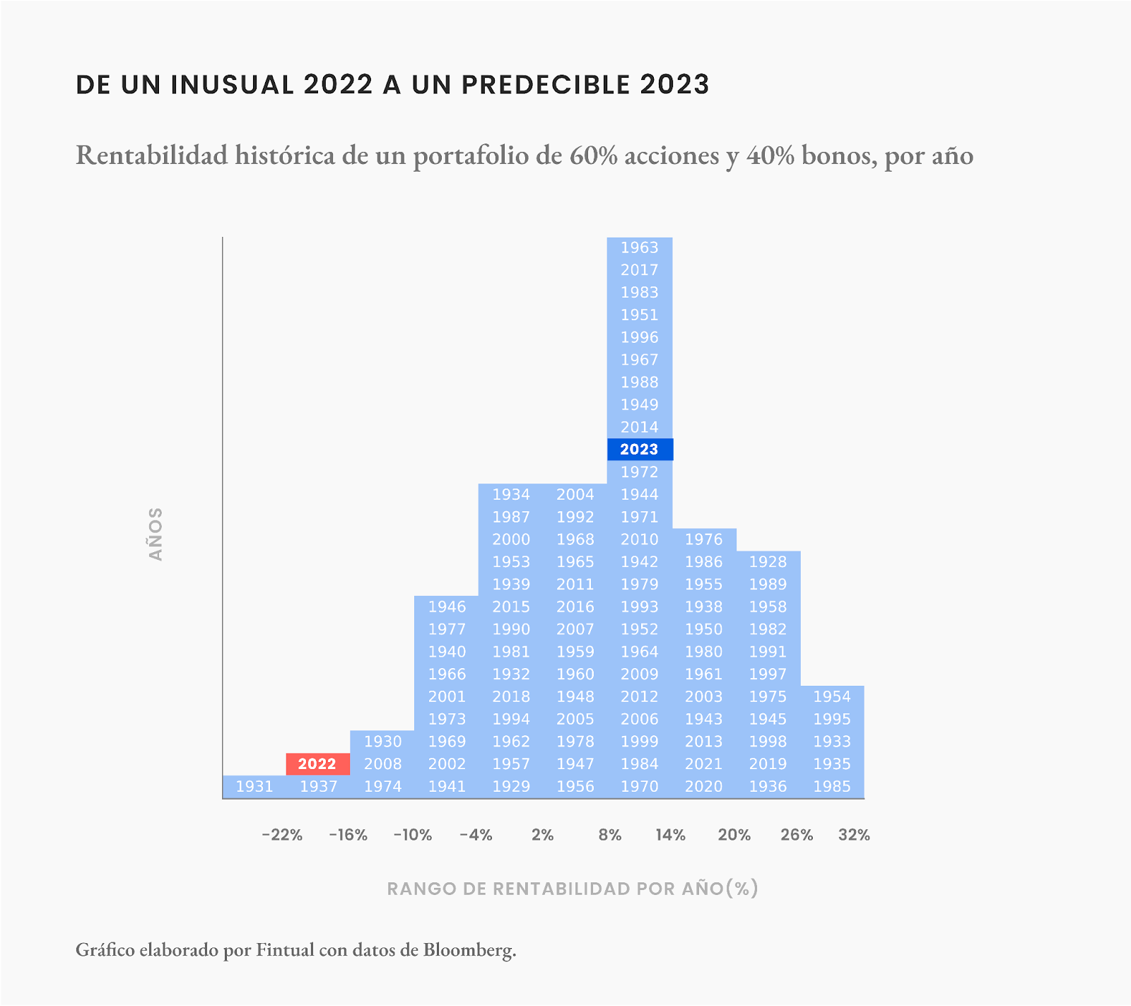 El gráfico ilustra la rentabilidad histórica de un portafolio con 60% en acciones y 40% en bonos, año por año, durante el último siglo. El 2022 se destaca en rojo, marcando un rendimiento anormalmente bajo y situándose junto a los peores años registrados, como 1931, año de la famosa Gran Depresión, y 1937, la recesión que hubo en consecuencia a la Gran Depresión. En contraste, el 2023, mostrado en azul, con un retorno dentro del rango más común y esperado.